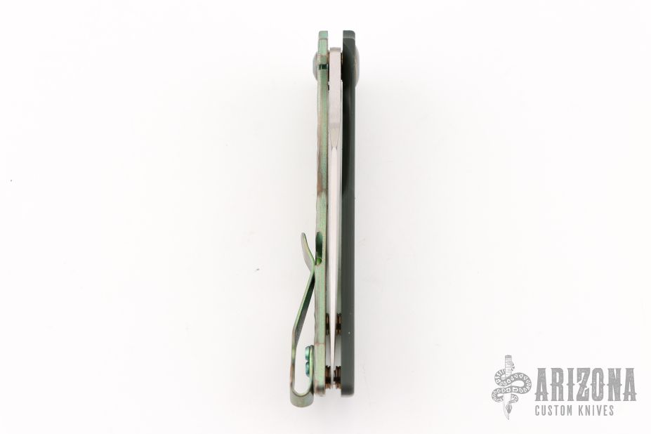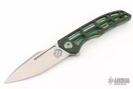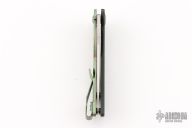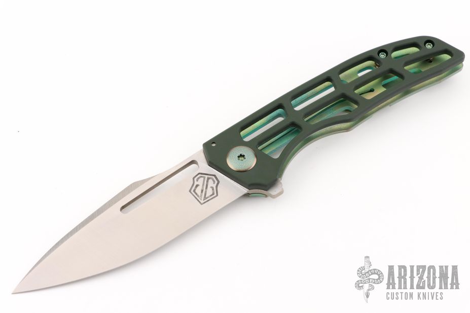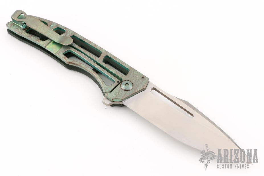 This Slitter from John Gray Knives features a drop point blade with a flipper. The handle has a ported green paper micarta covers, with anodized and textured titanium frame with orange peel/anodized pivot and tip up clip. Nice detent, lockup and blade seating. Comes with maker's pouch and patch. New from maker at the 2025 Blade Show!
