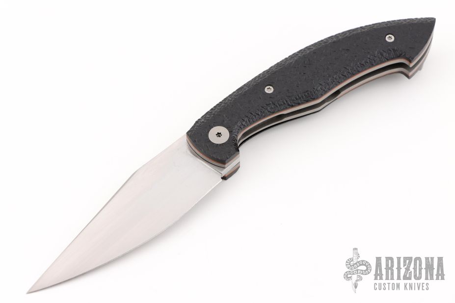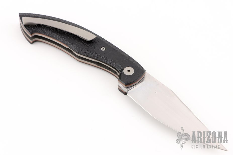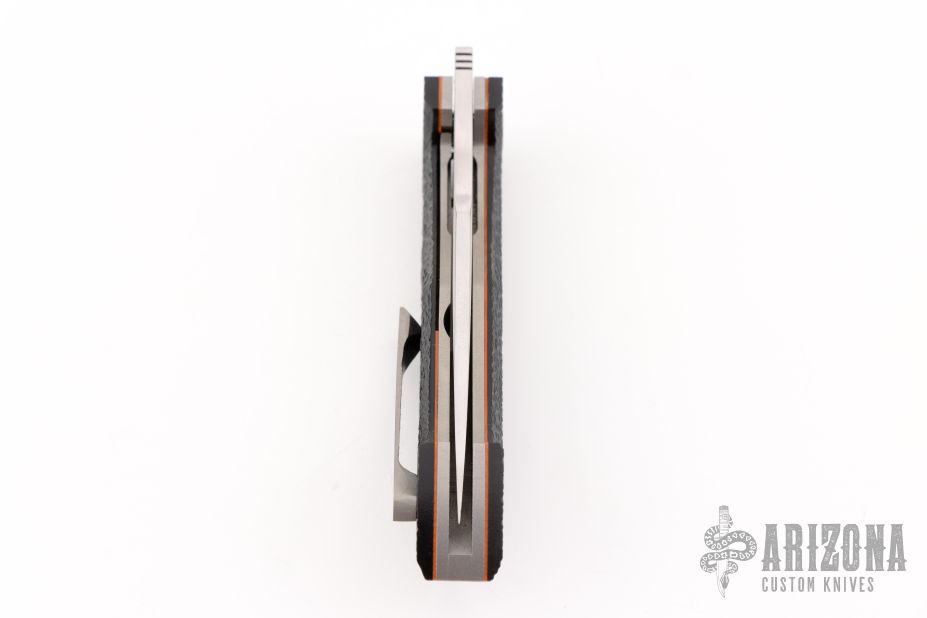 This Jinx linerlock front flipper by Ago Knives features a hand rub satin finished blade with notched thumbrest and front flipper. The handle has textured black G-10 scales with orange liners, bead blasted titanium liners and tip up clip with hidden screws, bead blasted titanium backspacer with textured black G-10 inlays. Rides on bearings, nice detent, lockup and blade seating. Comes with COA and maker's zipper case. New from maker at the 2025 Blade Show.
