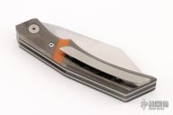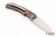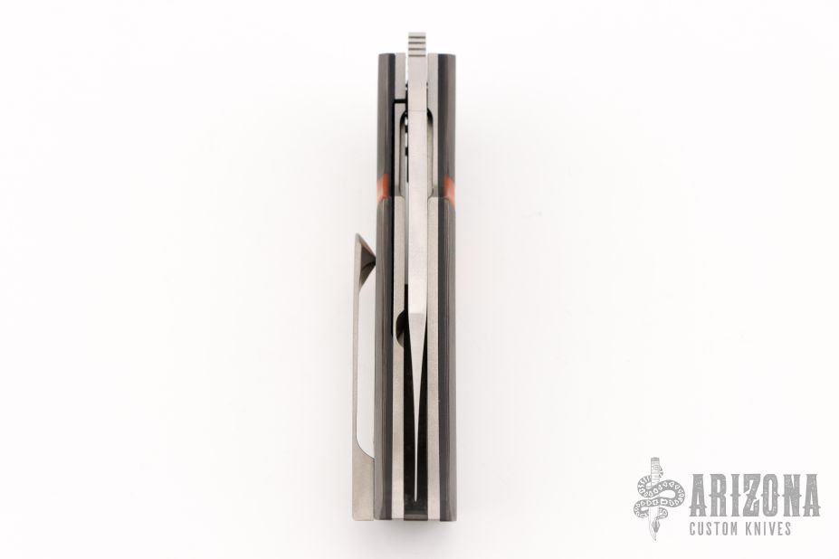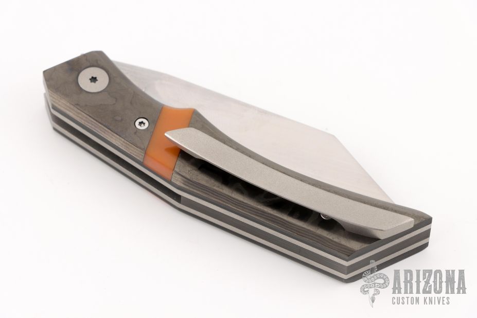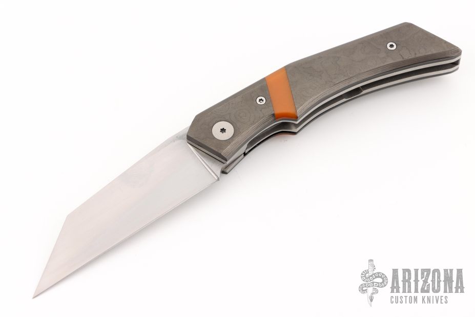 This Naska W linerlock front flipper by Ago Knives features a hand rub satin finished blade with notched thumbrest and front flipper. The handle has black camo carbon scales with Caramel paper micarta inlays and black liners, bead blasted titanium liners and tip up clip with hidden screws, black camo carbon backspacer. Rides on bearings, nice detent, lockup and blade seating. Comes with COA and maker's zipper case. New from maker at the 2025 Blade Show.