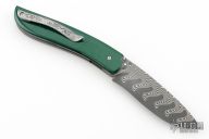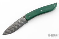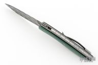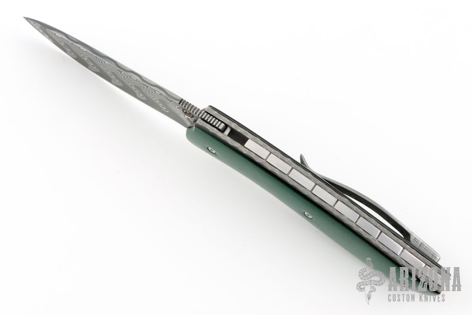 This Front Flipper Linerlock Folder by Tim Bernard features a Damacore blade with notched thumbrest and front flipper. The handle has Emerald Green Vintage paper micarta covers, blasted titanium liners with textured spines, notched stainless steel backspacer, Damascore tip up clip. Nice detent, lockup and blade seating. Comes with a leather slip sheath and COA. New from maker at the 2025 Blade Show!