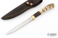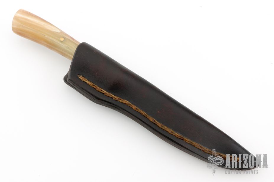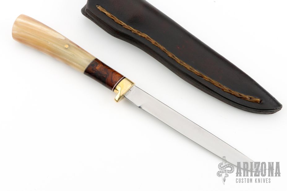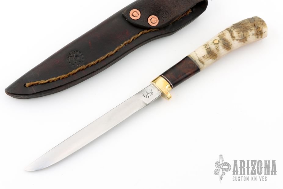 The beautiful McKenzie River flows through the Willamette Valley, running right through the ranch where I get to make my knives. Named for this incredible setting, I forged this gorgeous new McKenzie River Fillet from 1" 52100 steel and it measures 5" from tip to guard with a sensible degree of flexibility. The brass guard is soldered in place above black, maroon, white, and slate fiber spacers that collar and join premium desert ironwood burl with Ed Fowler's Willow Bow sheep horn that's pinned through the tang with brass. The overall length measures 9 1/2" and it comes guaranteed for life in one of my hand stitched leather pouch sheaths. Comes with a zippered case. New from maker at the 2025 Blade Show.