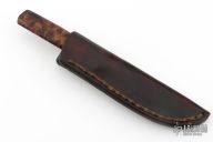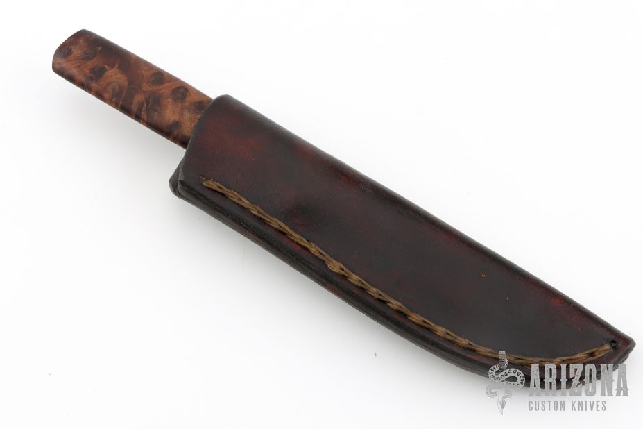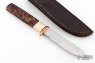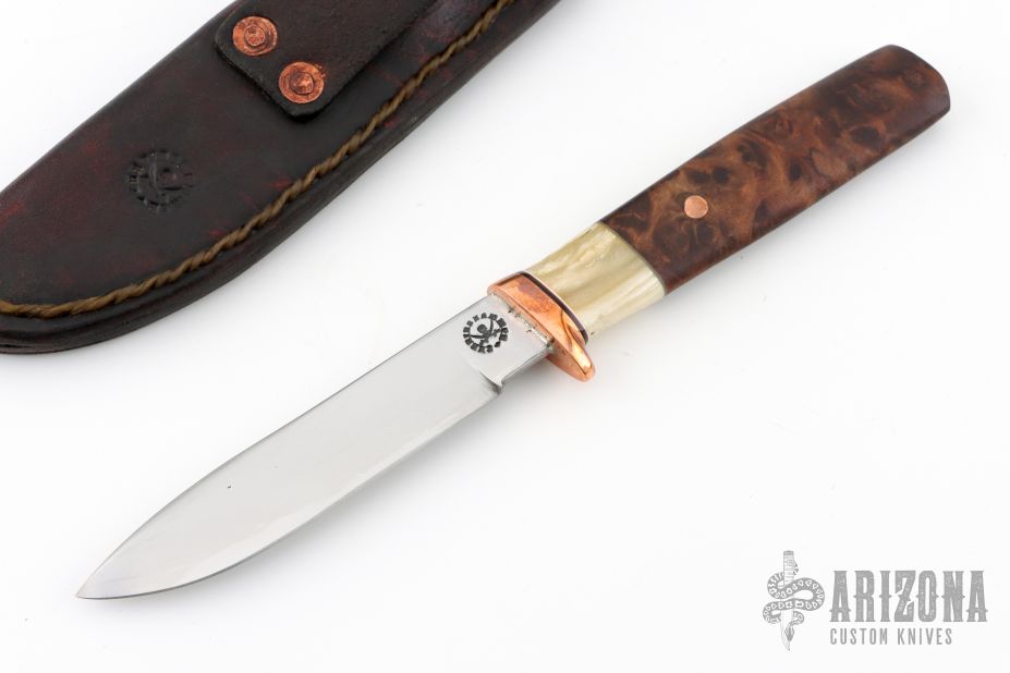 This outstanding new Cunningham Custom Shop Humpback is forged to shape and triple cycled 52100 steel that measures 4 1/2" from tip to guard with a razor sharp convex grind and a finger choke ricasso. The copper guard is soldered in place over black, maroon, white, musk ox boss and slate fiber spacers as well as a gorgeous redwood burl handle that I pinned through the tang with copper. The overall length measures 9" and it comes in a custom hand stitched leather pouch sheath and a felt lined Cunninghammer zipper case. My work is guaranteed for life. New from maker at the 2025 Blade Show.