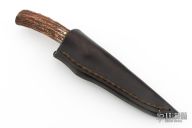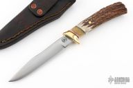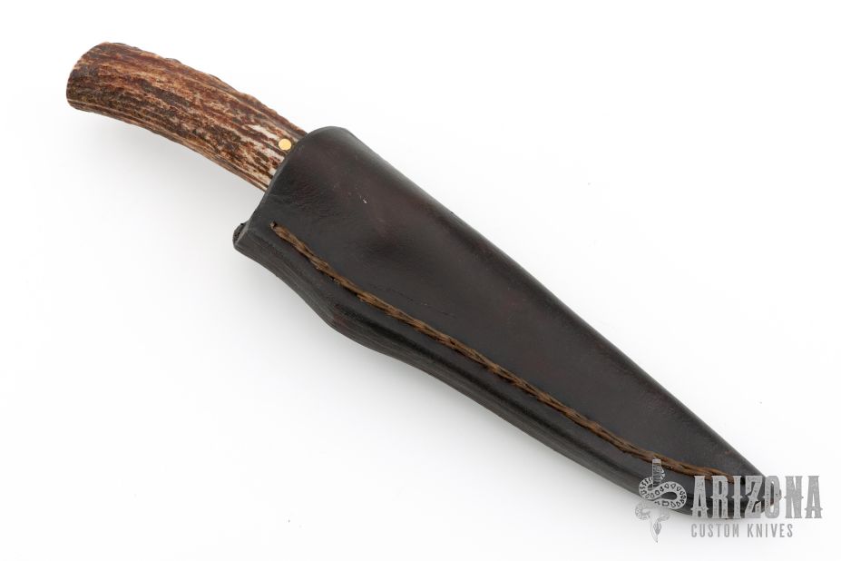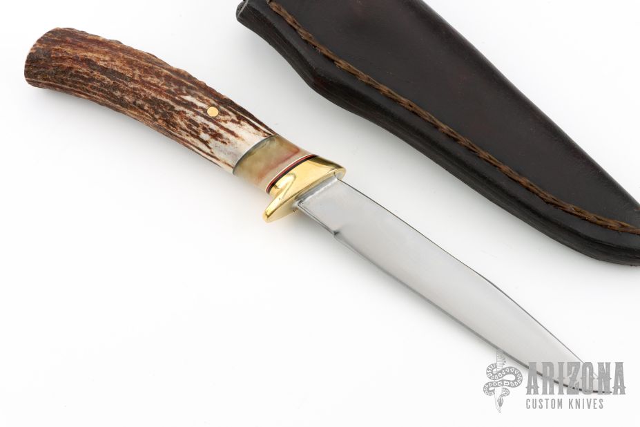 This stunning new Cunningham Custom Shop Clip Point is forged to shape and triple cycled 52100 steel that measures 5" from tip to guard with a razor sharp convex grind and a finger choke ricasso. The brass guard is soldered in place over black, maroon, white, Willow Bow sheep, and slate spacers as well as premium Hawaiian Axis stag that I pinned through the tang with brass. The overall length measures 10" and it comes in one of my hand stitched pouch sheaths as well as a Cunningham Custom Shop felt lined zipper case. My work is guaranteed for life! New from maker at the 2025 Blade Show.