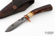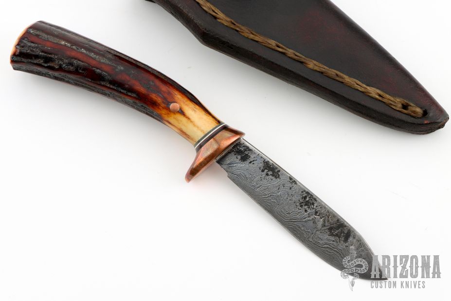 This sleek new Cunningham Custom Shop Drop Point was a really fun project. I had a drop of Damascus from a past project on the bench, and I wanted to see what I couldn't forge out of it. The steel is a 416 layer blend of 1095 and 15n20 from Alabama and even with the abnormal hammermarks (no one does that on Damascus...), I was super pleased with this little option. It measures 3 1/4" from tip to guard with a razor sharp convex grind. A nice 1/4" thick copper guard is soldered in place over black, vintage brick, white, and slate fiber spacers that beautifully meet top notch sambar stag. A copper pin runs through the tang and overall length measures 6 3/4"- a wonderful fit in the hand. This one comes guaranteed for life with one of my hand stitched pouch sheaths. Comes with a zippered case. New from maker at the 2025 Blade Show.