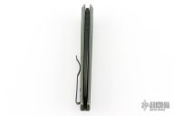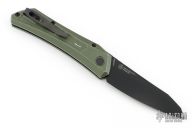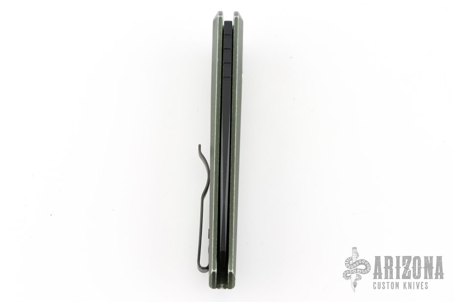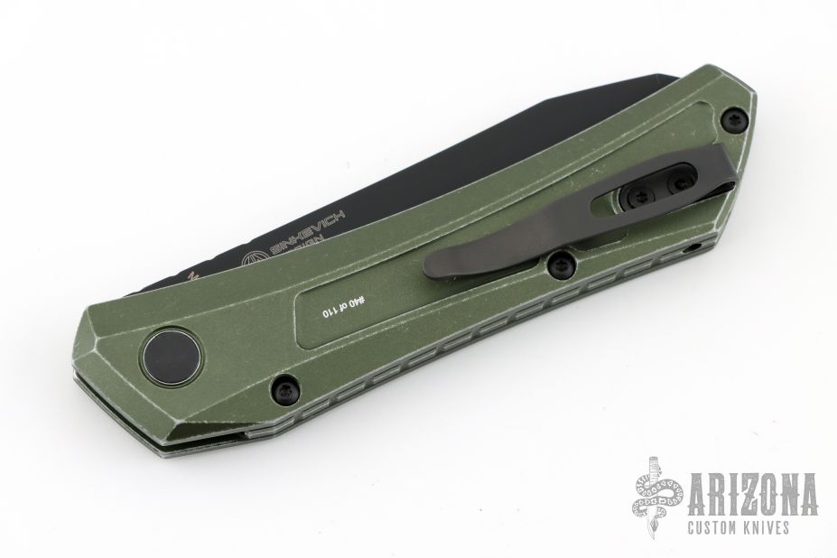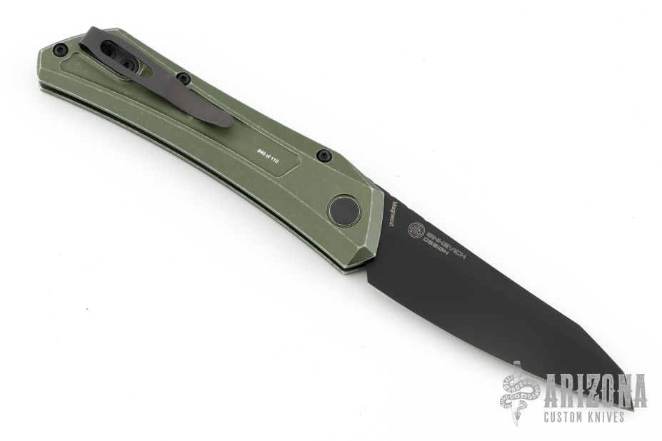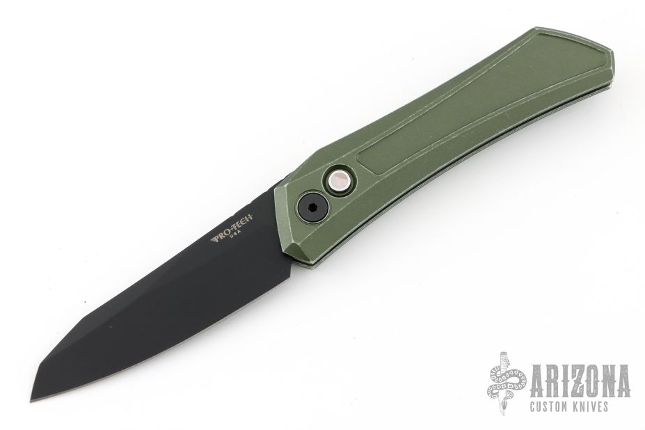 This Oligarch by Pro-Tech Knives features a black wharncliffe shaped blade. The handle has a distressed green anodized aluminum frame with a stainless deep carry tip up clip and a pearl inlaid button. Comes with original box and papers. New from maker at the 2025 Bladeshow!