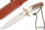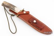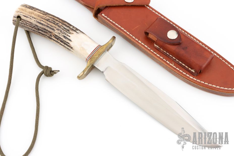 "This Randall Knives Model 1 was made famous by Allied combat troops in World War II and has since been widely used in all theaters of war." .205" blade stock. 1.225" blade depth, satin finish blade with sharpened top edge, hidden tang construction. The handle has a brass guard and stag grip with red/white/blue spacers, lanyard hole at the butt. Includes a brown leather sheath. Has a couple very light scratches, otherwise excellent condition.