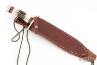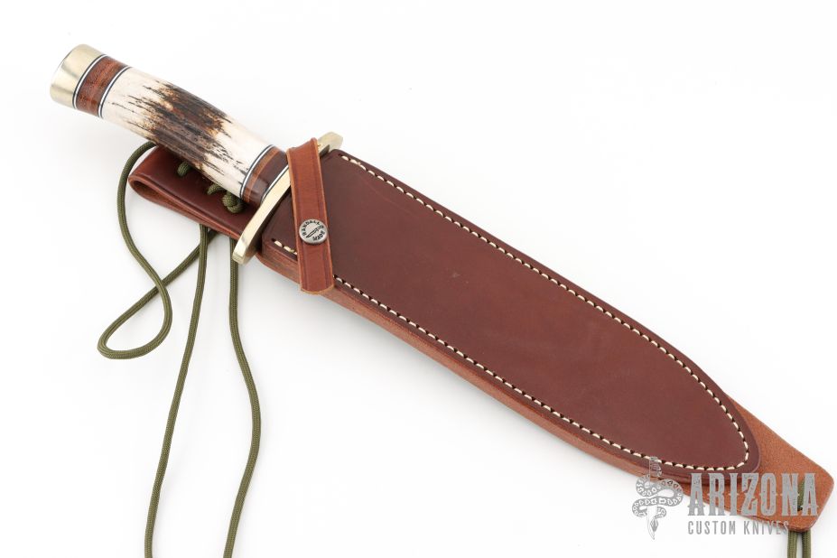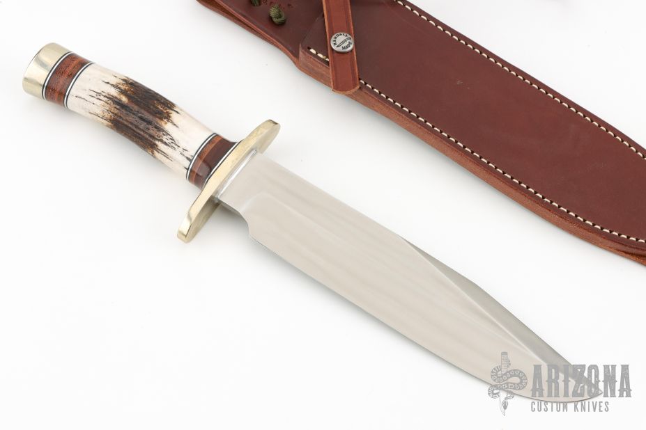 The Model 12 was made to meet the demand for a heavy-duty sporting knife of the Bowie type. This non-catalog version has a Model 14 grind. This knife has a 9" blade with sharpened top edge, .227" blade stock and 1.780" blade depth, hidden tang construction. The handle has a forward curved nickel silver guard and butt, stag grip with black/duralumin/stacked leather spacers. Includes a brown leather sheath. Excellent condition.