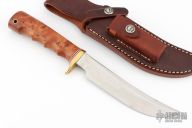 This model 4-6 from Randall Made Knives has an upswept satin finished blade with false top edge, .205" blade stock and 1.111" blade depth, hidden tang construction. The handle a brass guard, finger groove thuya burl wood grip, red/white/blue spacers, lanyard hole. Includes brown leather sheath. Has a couple light scratches, otherwise excellent condition.