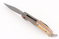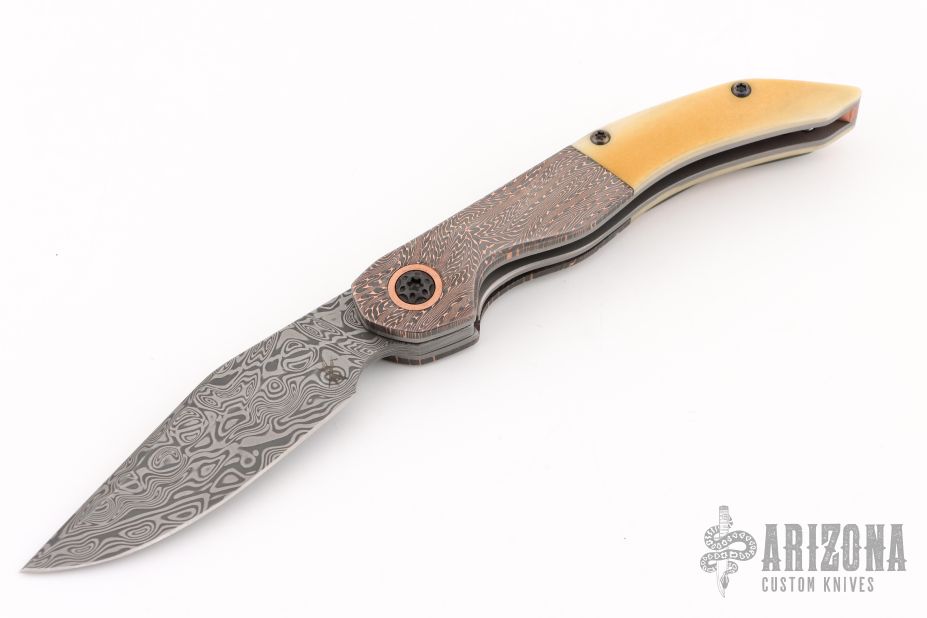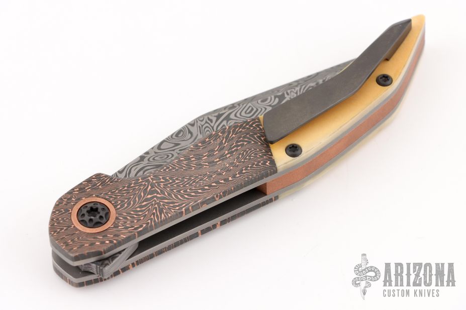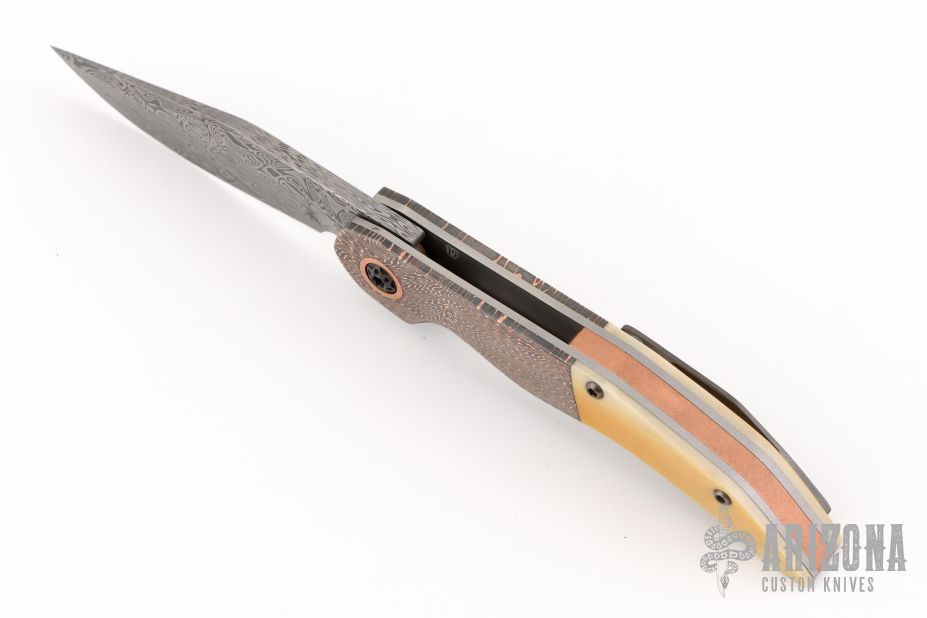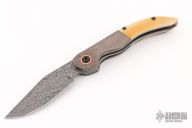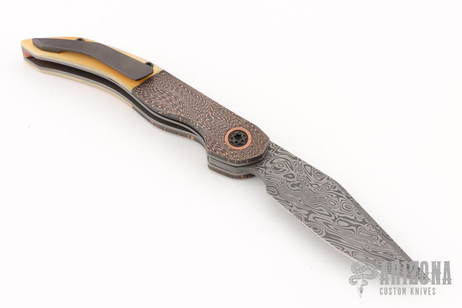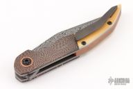 This Linerlock Whippet by Keanison Knives features a Damasteel blade and flipper.  The handle has Baker Forge Damascus bolsters, copper pivot collars, Micarta scales, bead blasted titanium liners, with a zirconium tip up clip with hidden screws.  Copper Backspacer. Rides on bearings, nice detent, lockup and blade seating. Comes with original box and COA dated 05/06/2025. New from maker!