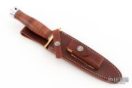 The Model 2 is a heavily made dagger or dirk. This knife has an 6" carbon steel blade with .201" blade stock and 1.147" blade depth, hidden tang construction. The handle has a double brass guard, stacked leather grip with red/white/blue spacers, duralumin butt with lanyard hole. Comes with a brown leather sheath. Excellent condition.