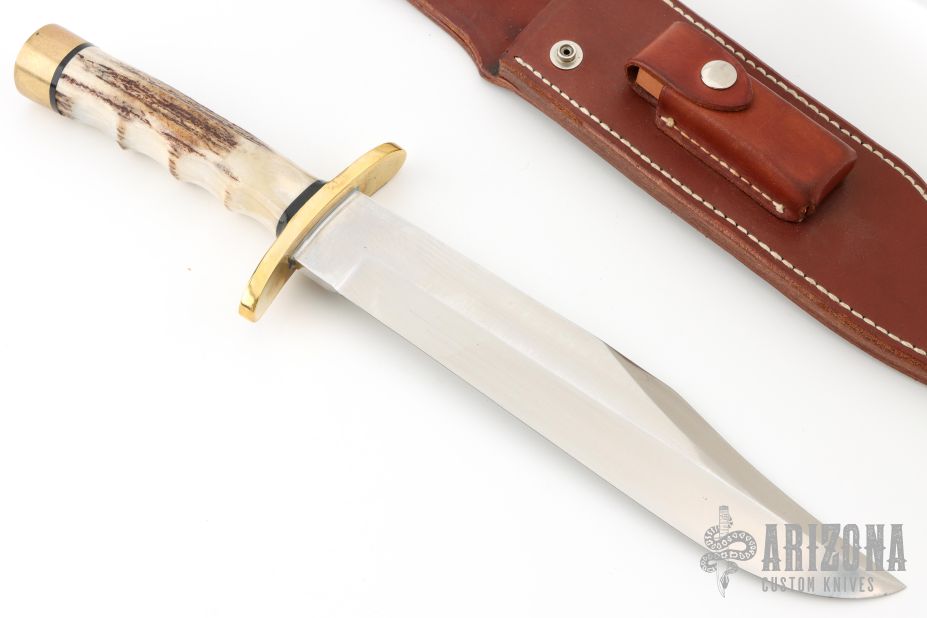 The Model 12 was made to meet the demand for a heavy-duty sporting knife of the Bowie type. This knife has a 9" carbon steel blade with sharpened top edge, .235" blade stock and 1.727" blade depth, hidden tang construction. The handle has a forward curved bras guard and butt, finger groove stag grip with black spacers. Comes with a brown leather sheath. Excellent Condition.