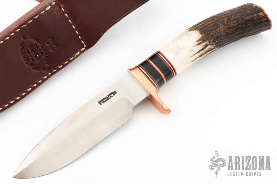 This Copper Companion by Randall Made Knives features a stainless steel blade, .201" blade stock, 1.263" blade depth, sharpened top edge and notched thumbrest, hidden tang construction. The handle has a copper guard and butt plate, stag grip and red/black/copper/black linen micarta spacer pattern. Comes with brown leather sheath. New from maker.