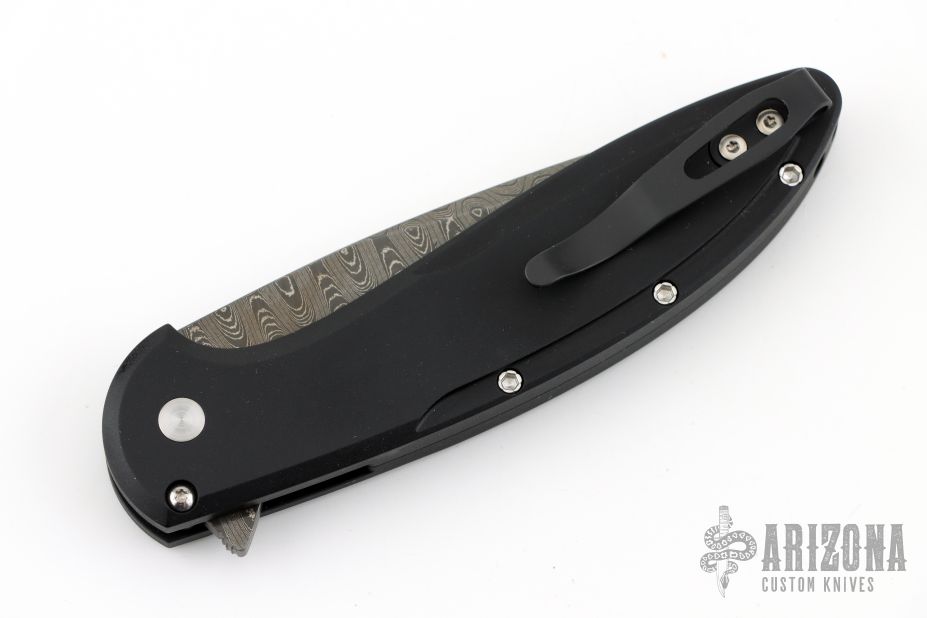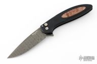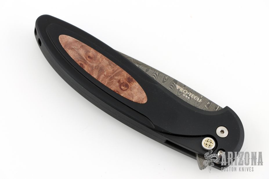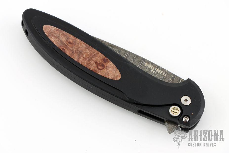 This Custom Cambria flipper by Pro-tech features a Nichols Ladder pattern Damascus blade with flipper. The handle has a black aluminum frame with maple burl inlay in the frame and mosaic pin inlaid push button, tip up deep carry stainless steel clip. Rides on bearings, nice detent, lockup and blade seating. Comes with original box, pouch and papers. New from maker at the 2025 Blade Show!