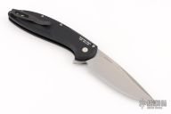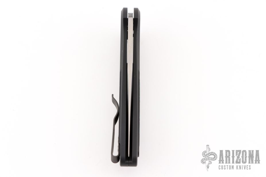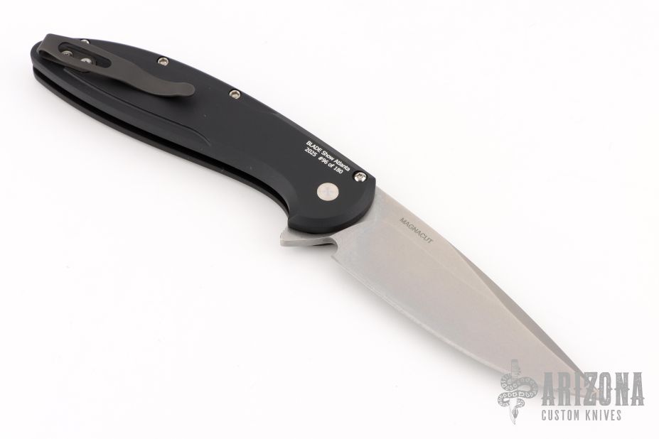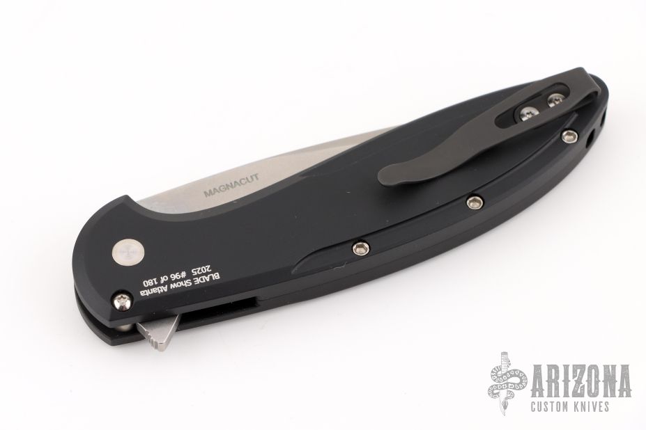 This Cambria flipper by Pro-tech features a bead blast and tumble finished blade with flipper. The handle has a black aluminum frame with carbon fiber inlay in the frame and black lip pearl push button, tip up deep carry stainless steel clip. Rides on bearings, nice detent, lockup and blade seating. Comes with original box, pouch and papers. New from maker at the 2025 Blade Show!