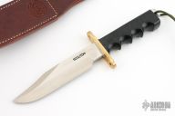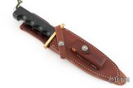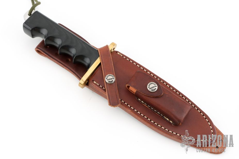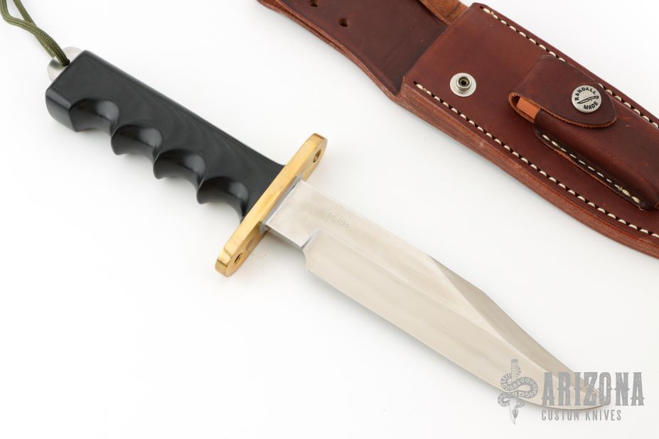 This Buxton Fighter by Randall Made Knives has a satin finished blade with sharpened clip, .234" blade stock and 1.418" blade depth, full tang construction. The handle has a brass guard, black linen micarta handle with finger grooves. Comes with brown leather sheath. Excellent condition.