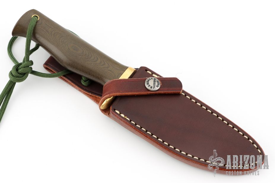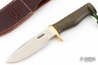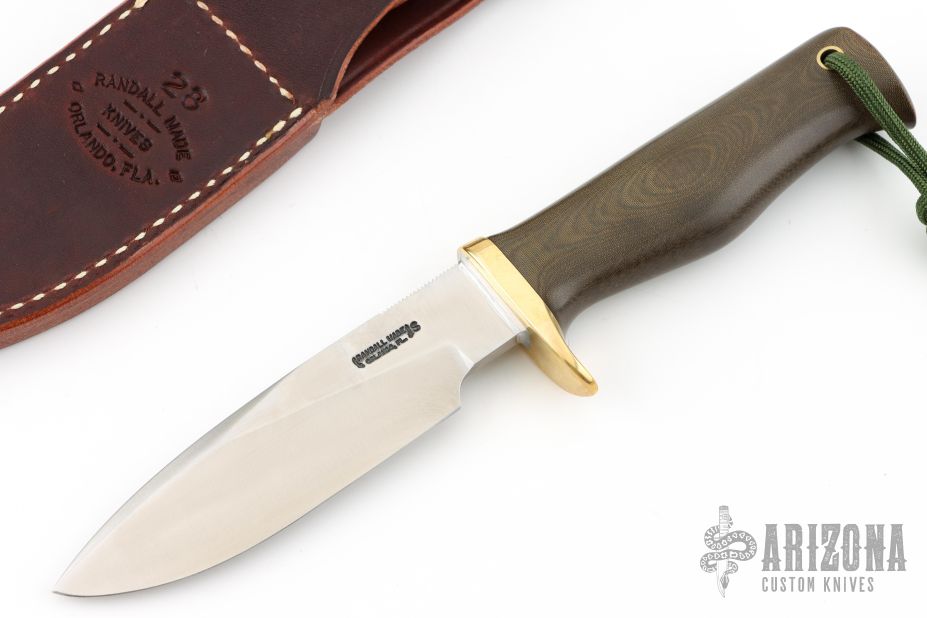 The Model 28 by Randall Made Knives is an excellent skinning and outdoors knife. Has a satin finished drop point blade with false top edge and notched thumbrest, stainless steel blade, .175" blade stock and 1.162" blade depth, full tang construction. The handle has a brass guard, green linen micarta handle and a lanyard hole at the butt. Comes with brown leather sheath. Excellent condition.