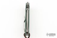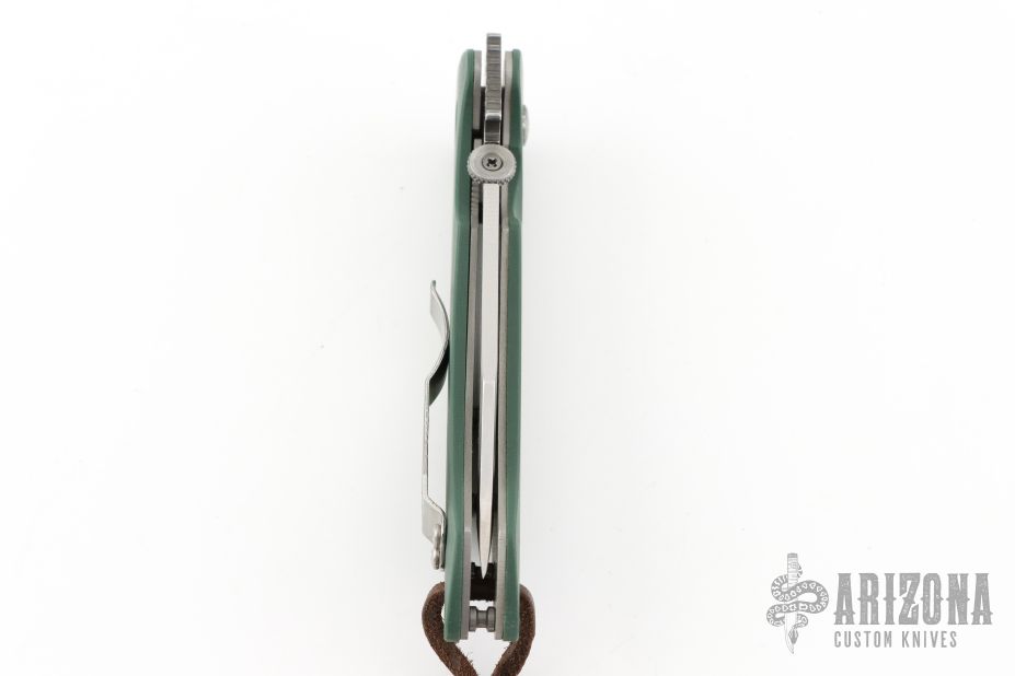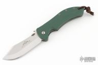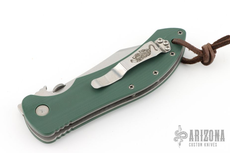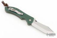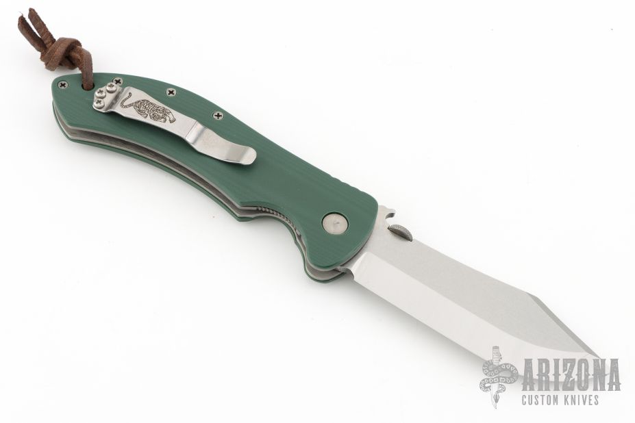 This Market Skinner by Emerson Knives features a two-tone blade with notched thumbrest and thumbdisc. The handle has custom green G-10 scales, titanium liners, tip up stainless steel clip. Comes with original box, black G-10 scales and papers. Nice detent, lockup and blade seating. Has been resharpened, otherwise excellent condition. #0130