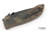 This PoBoy Super Commander by Andrew Charlet features a black recurve blade with a custom thumbdisc and wave feature. The handle has canvas micarta scales, titanium liners and a tip up stainless steel clip. Comes with original box and papers. Has some minor wear on the blade finish, otherwise excellent condition.