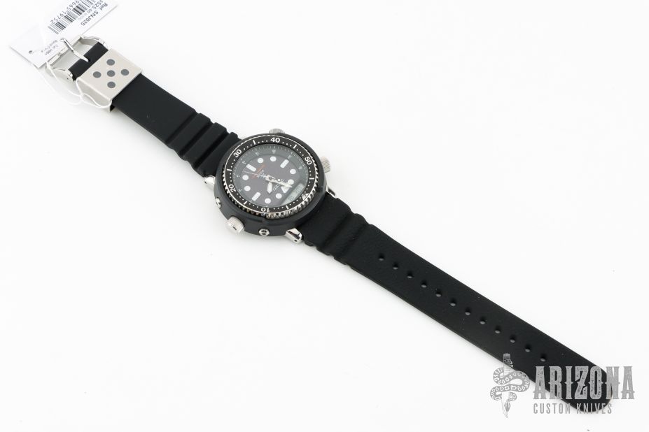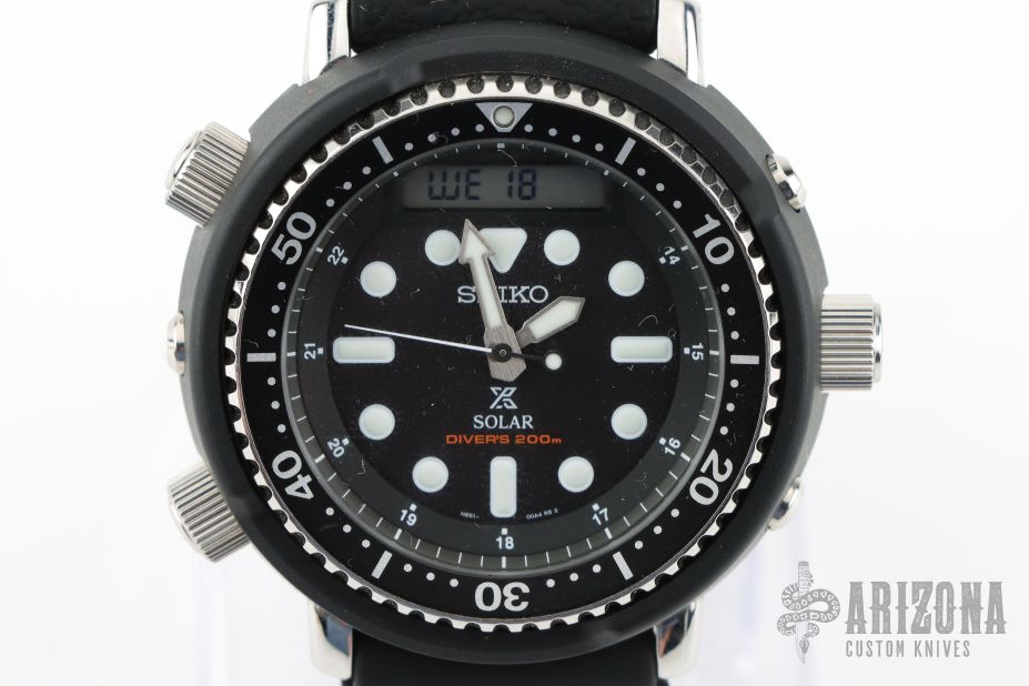 Prospex Solar Hybrid Diver - Modern Interpretation of the 1982 Hybrid Diver’s Watch. Designed for those who treat life as the ultimate adventure, the Seiko Prospex line meets every challenge with technological excellence and winning design. This superbly functional timepiece is a modern interpretation of Seiko’s 1982 landmark H558-5000, the first hybrid analogue-digital diver’s watch with alarm and chronograph. Essential equipment on several expeditions to Mount Everest, the design was also featured in a number of hit action films. The digital display offers time, date, alarm and chronograph readouts with a stopwatch function, power reserve indicator and dual time capability, while the black analogue dial features LumiBrite hands and markers. The energy-efficient Solar Cell, powered by any light source, with no battery change required, provides a 6-month power reserve when fully charged. With a black one-way rotating elapsed timing bezel, this versatile watch includes a lightweight matte black case, secure screwdown crown, pushers and caseback, and durable silicone strap, and follows ISO standards for scuba diving. 200m Water Resistant.