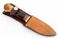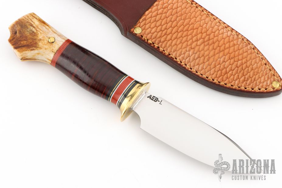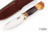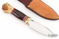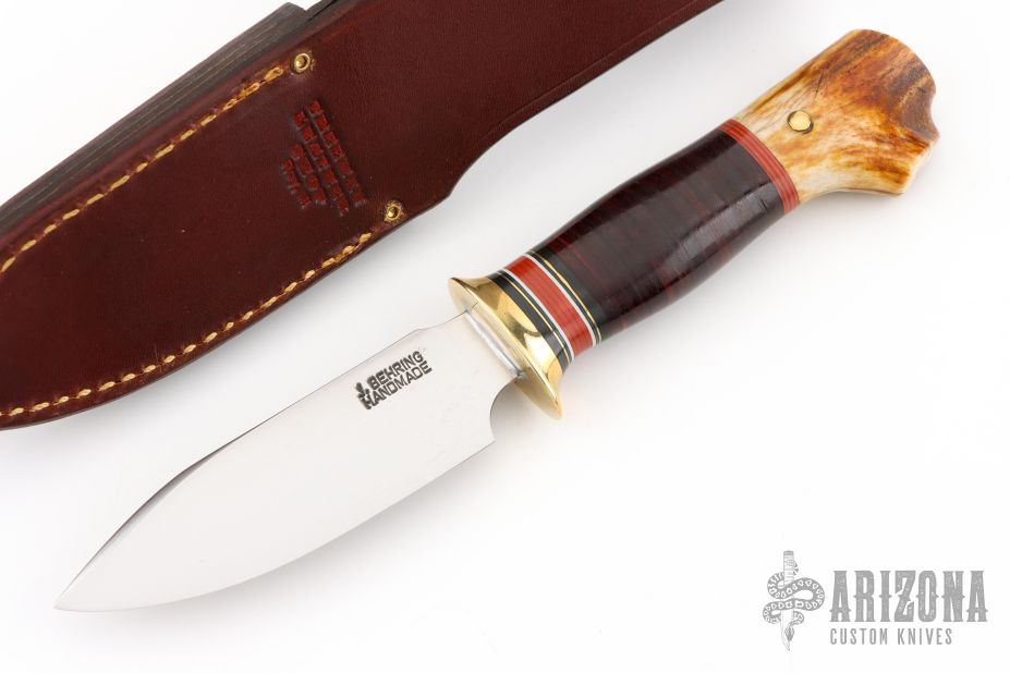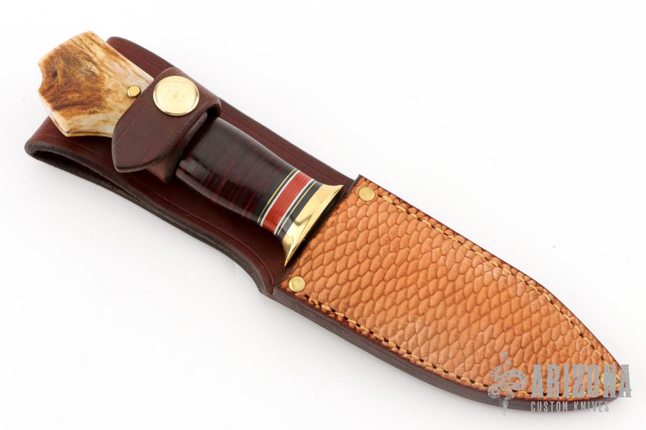 This Hunter by Jim Behring features a satin finished blade with 0.096" blade stock and 1.107" blade depth, hidden tang construction. The handle has a brass guard, black/red/brassspacers. Stacked horsehide leather with pinned crotch stag butt. Comes with a brown leather sheath with premium beaver tail panel. New from maker at the 2025 Blade Show!