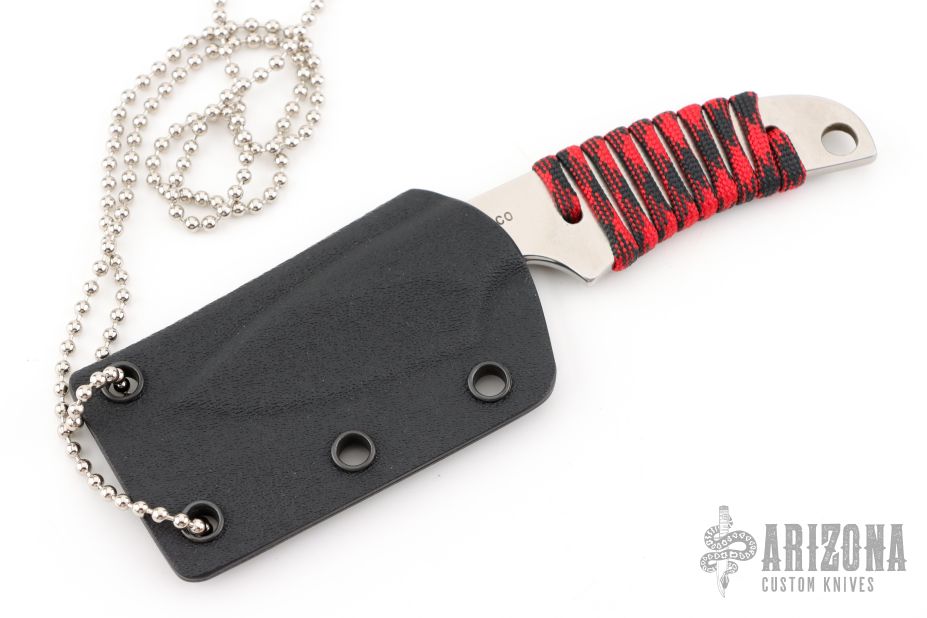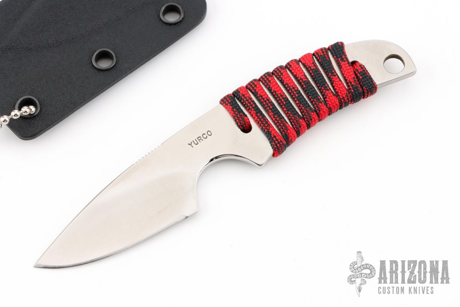 Joanne Neck knife by Mickey Yurco. Full tang construction, .141" bladestock, .989" blade depth, lanyard hole in pommel and cord wrapped handle. Comes with a kydex neck sheath with chain. New from maker at the 2025 blade show! #4725