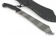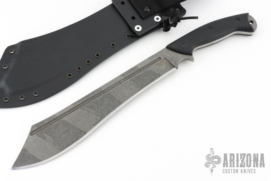 This Warhammer by Work Tuff Gear features a tiger stipe finished SK85 Steel blade with a saber grind that has a convex cutting edge, fullers, .228" blade stock and 2.334" blade depth, full tang construction. The handle has black G-10 scales. Comes with a nicely fitted kydex sheath, zippered case. New from maker at the 2025 Blade Show. Second Production Run Dated 05/2025.