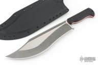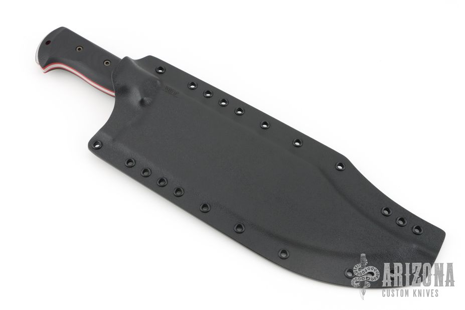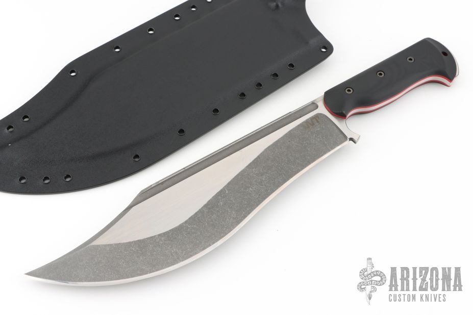 This Hellion by Work Tuff Gear features a two-tone finished K329 Steel blade with false top edge and a convex cutting edge, has fullers, .183" blade stock and 3.028" blade depth, full tang construction with black G-10 scales with red liners. Comes with a kydex sheath and zippered case. New from maker at the 2025 Blade Show. 1st Production Run Dated 12-2024
