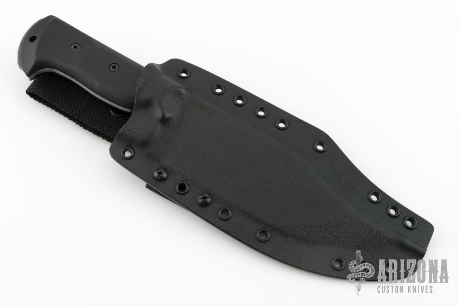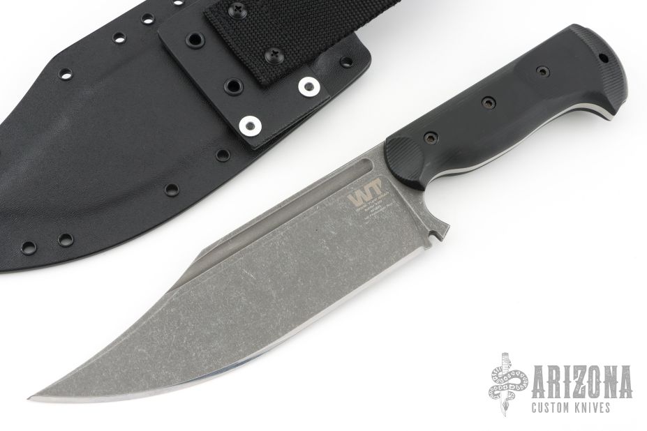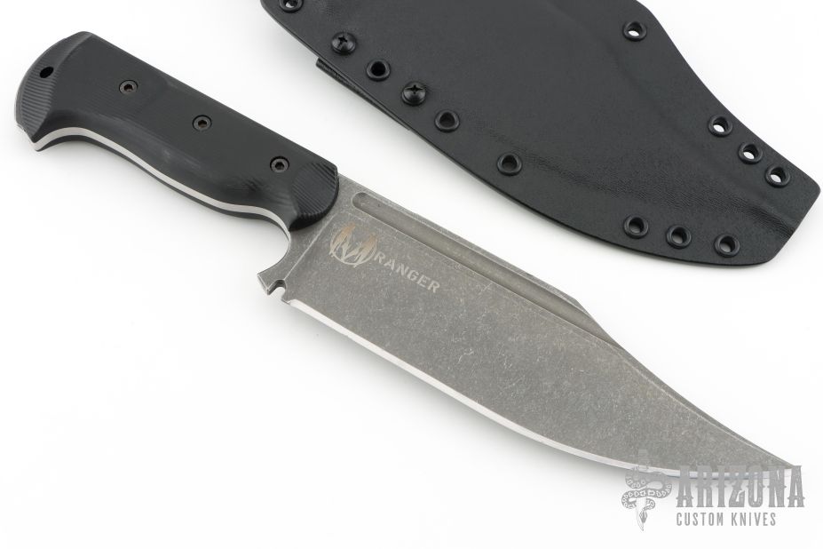 This Ranger by Work Tuff Gear features a dark stonewash finished K329 Steel blade with false top edge and a convex cutting edge, has fullers, .185" blade stock and 2.245" blade depth, full tang construction with black G-10 scales. Comes with a kydex sheath and zippered case. New from maker at the 2025 Blade Show. 1st Production Run Dated 05-2025