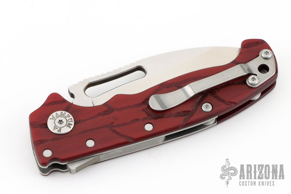 This AD20 by Andrew Demko features a satin finished blade with notched thumbrest and dual thumbstuds. The handle has a tree-bark finished G10 frame with a tip up stainless steel clip and "shark" lock release on the spine. Comes with a zippered case. Excellent Condition.