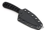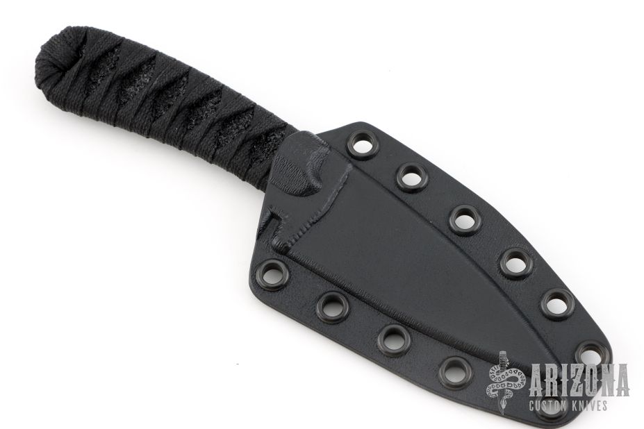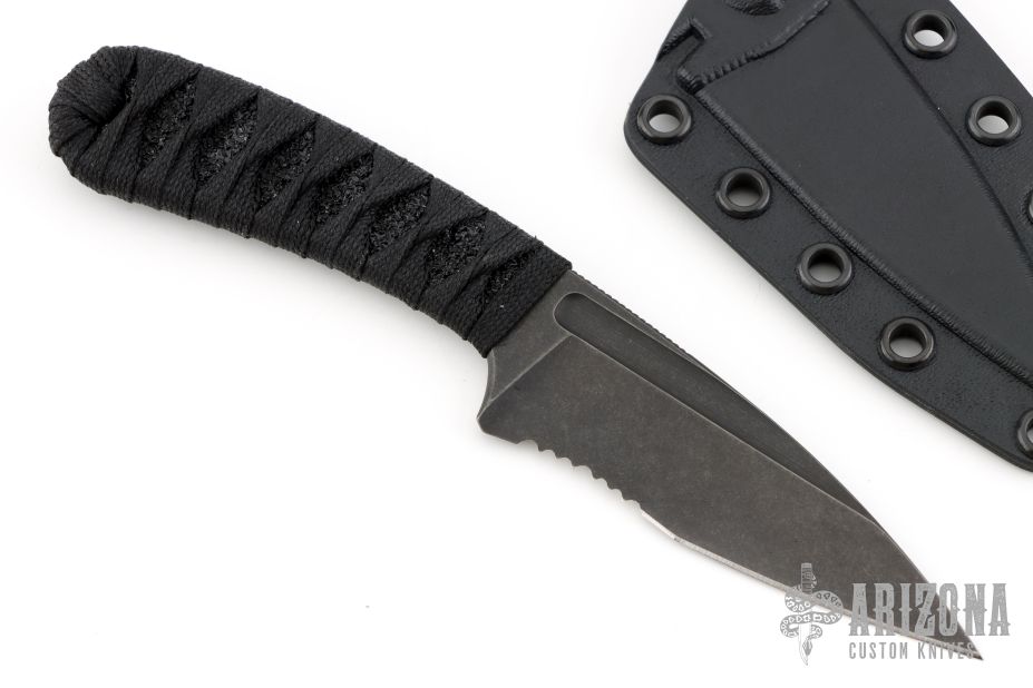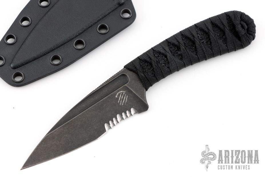 This SIN by Bastinelli Knives features a black finish recurve partially serrated blade with notched thumbrest and fullers, .138" blade stock and 1.249" blade depth, full tang construction. The handle has a custom cord wrap over black textured tape. Comes with kydex sheath and zippered case. New from maker at the 2025 Blade Show.