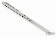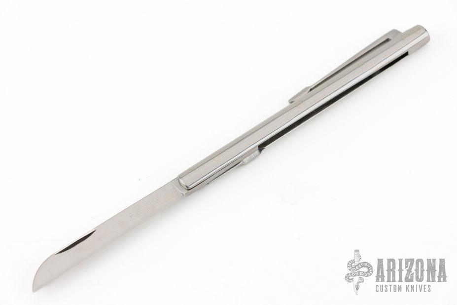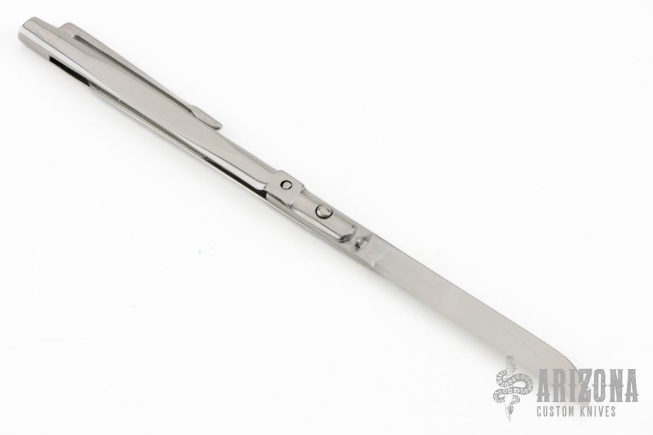 Hand made from stainless steel. Has a pinch locking type mechanism. Separate the handle with your fingers to close.