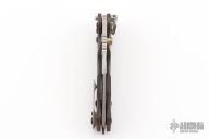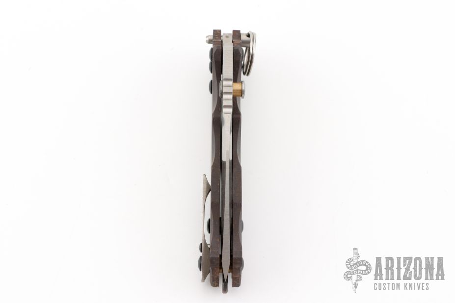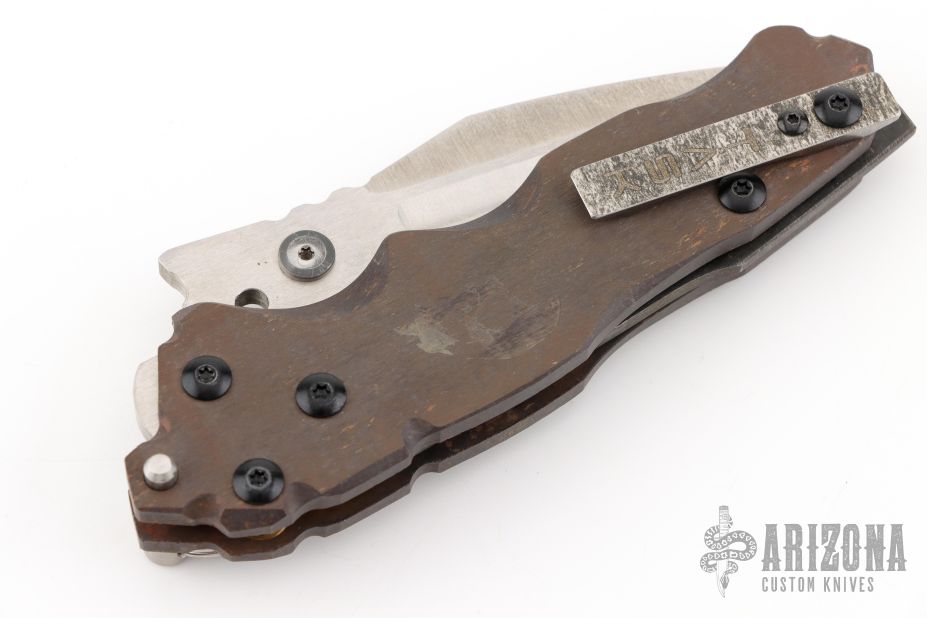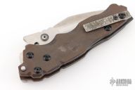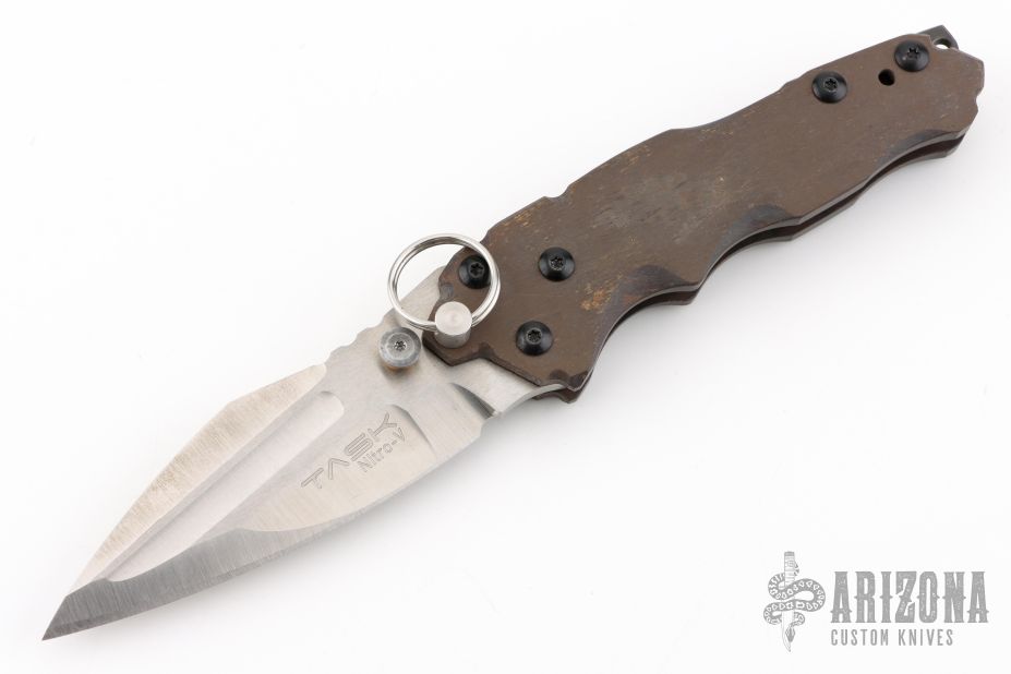 This Intruder by TASKnives features a multi-tone acidwash/satin finished, multi-ground blade with a notched thumbrest, and false top edge. The handle has distressed titanium scales. Knife does not lock, it is a slipjoint. Has tip up clip, lanyard bail and floating spring. Comes with a pin to lock the blade to the frame. Comes with original box. New from maker at the 2025 Blade Show!
