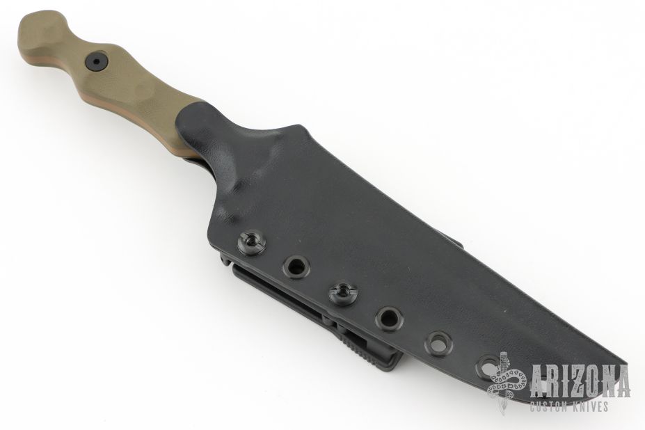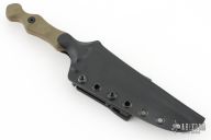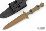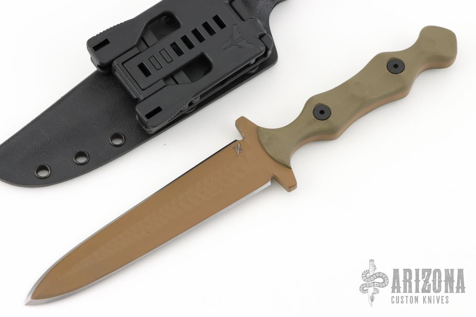 This Dagger by Stroup Knives features a FDE cerakote double edged blade with sculpted flats and a full tang construction.  .194" Blade Stock.  1.151" Blade Depth.  The handle features sculpted green G-10 scales.  Includes a kydex sheath with a Tek-Lok and the original box and papers.  New from Maker at the 2025 Blade Show.