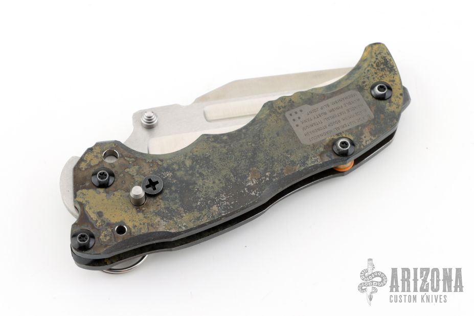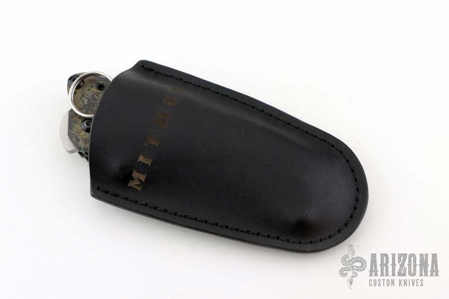 This Mitrul by TASKnives features a multi-tone stone wash/satin finished, multi-ground blade with a notched thumbrest, and false top edge. The handle has distressed titanium scales. Knife does not lock, it is a slipjoint. Floating spring. Comes with a pin to lock the blade to the frame. Comes with leather pocket sheath. New from maker at the 2025 Blade Show!