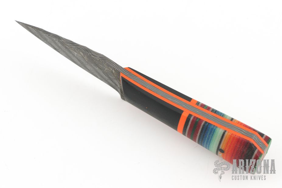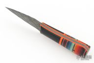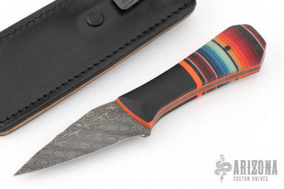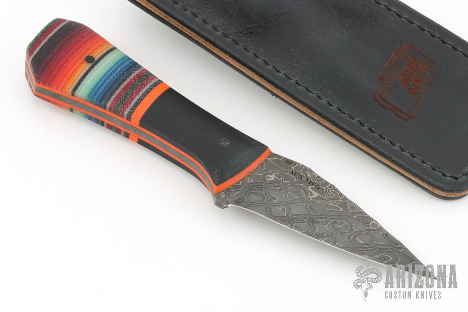 This Coffin Leaf by Auxiliary Manufacturing features a Vegas Forge Lytic Damascus blade with .121" blade stock and .975" blade depth. The handle has multi piece Serape and G-10 scales. Comes with a black leather sheath with clip. Comes with original box and papers. New from maker!