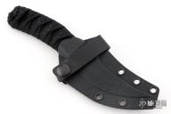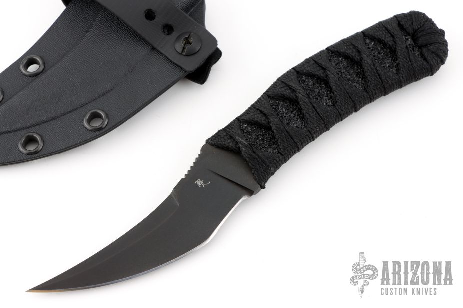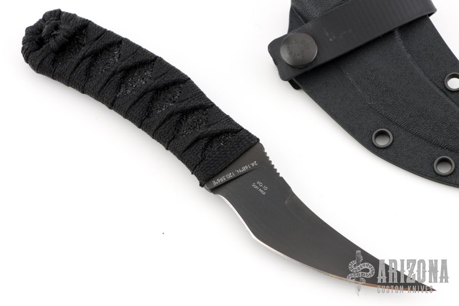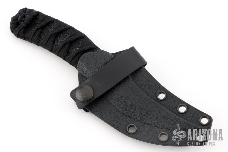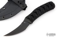 This DBS by Bastinelli Knives features a black San Mai blade with notched thumbrest and false top edge, .158" blade stock and 1.120" blade depth, full tang construction. The handle has a custom black cord wrap. Comes with kydex sheath and zippered case. New from maker!