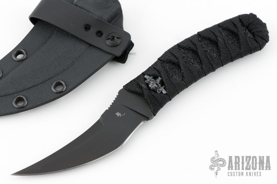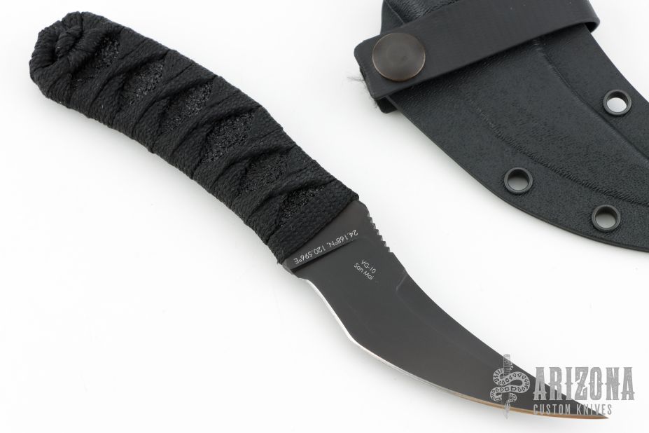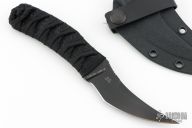 This DBS by Bastinelli Knives features a black San Mai blade with notched thumbrest and false top edge, .158" blade stock and 1.120" blade depth, full tang construction. The handle has a custom black cord wrap with menuki. Comes with kydex sheath and zippered case. New from maker!