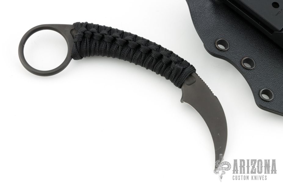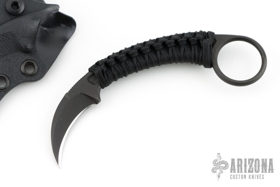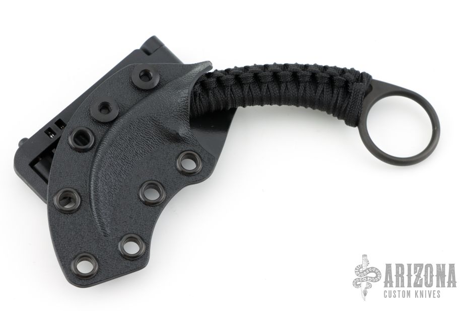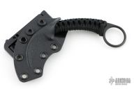This PiKa is a Doug Marcaida design produced by Bastinelli Knives, it features a chisel ground hawkbill blade with black PVD finish, notched thumbrest and swedge, .159" blade stock and .676" blade depth, full tang construction. The handle has black wrap. Comes with kydex sheath with belt clip and a zippered case. New from maker!