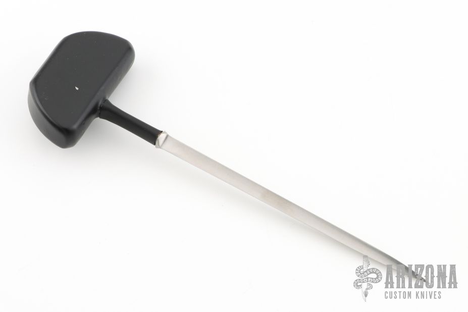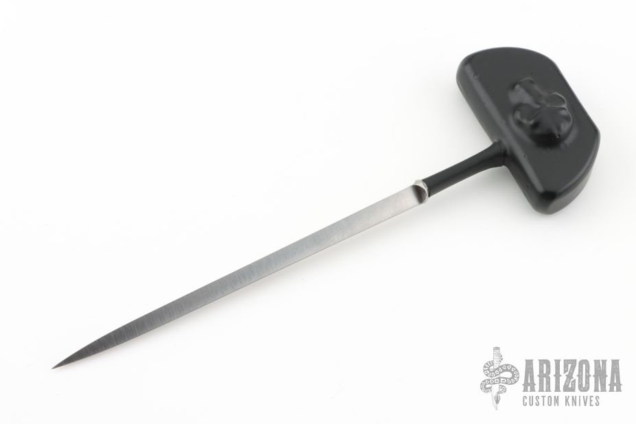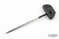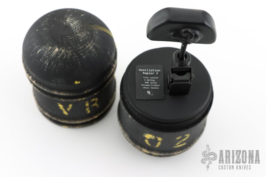 This Ventilation Rapier P by Bastinelli Knives features a satin finished triangle blade, 4.25" spike that is .225" in diameter. It has a polymer/rubber skull handle. Comes with a 3D printed sheath with Ulti-clip. Comes with a custom 3D printed Capsule with  ID plate.  New from maker.