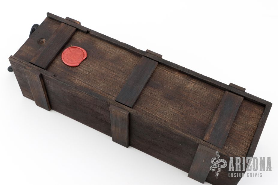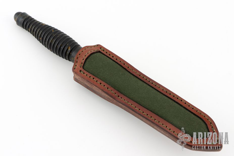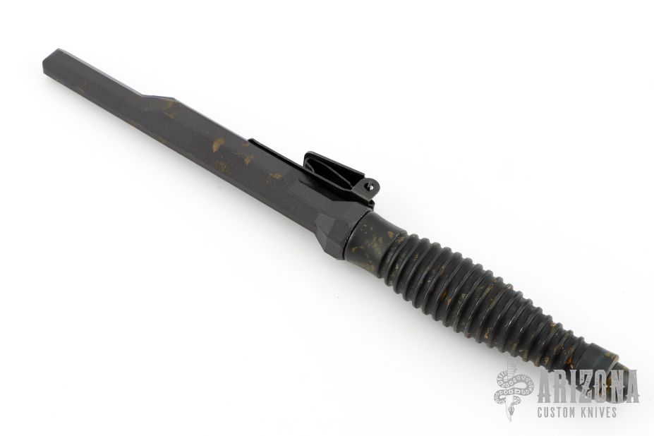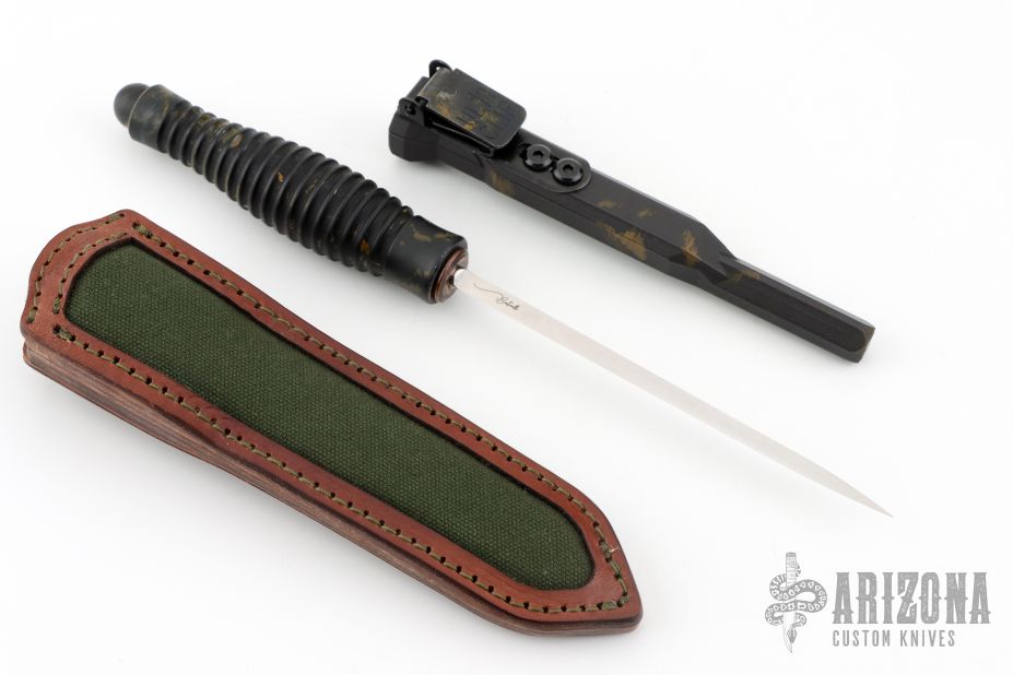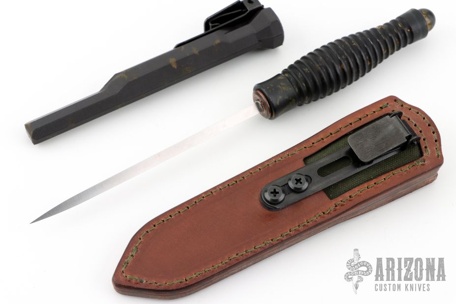 This Fairbarn Spike by Bastinelli Knives features a satin finished triangle blade, 5.25" spike that is .235" in diameter. It has a ribbed aluminum handle with cerakote finish. Comes with a 3D printed sheath with Ulti-clip. Comes with a brown leather and green canvas sheath with Ulti-Clip. Comes with original wooden box.  New from maker.