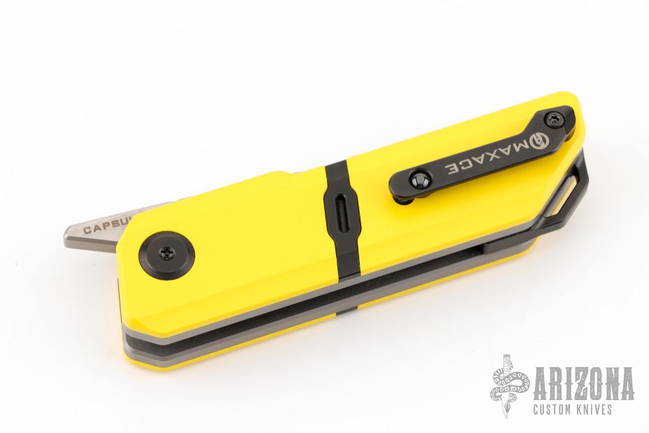 This Capsule by Maxace features a two-tone blade with notched thumbrest and milled fullers. The handle has a black/yellow cerakote finished frame with titanium liners, backspacer and tip up clip. Comes with original box and zipper case. Excellent condition.