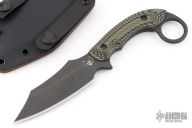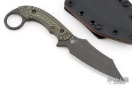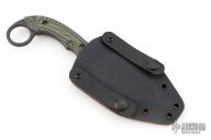 This KaramBat by Bat Cave Blades is inspired by the traditional Karambit style fighting knife. This knife has a black coated Nitro-V blade sharpened to 18 degrees, notched thumbrest, .190" blade stock, 1.402" blade depth, full tang construction. The handles are 45 degree contour pattern green/black G-10 scales. Includes a leather lined, black kydex sheath and COA. New from maker!