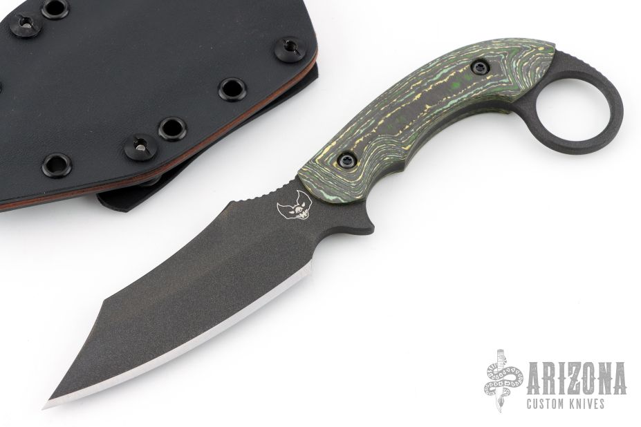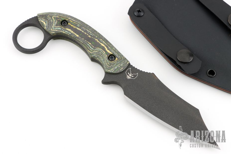 This KaramBat by Bat Cave Blades is inspired by the traditional Karambit style fighting knife. This knife has a black coated Nitro-V blade sharpened to 18 degrees, notched thumbrest, .190" blade stock, 1.406" blade depth, full tang construction. The handles are contour pattern Toxic Storm Fat Carbon scales. Includes a leather lined, black kydex sheath and COA. New from maker!