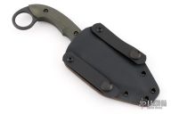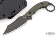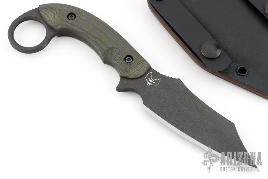 This KaramBat by Bat Cave Blades is inspired by the traditional Karambit style fighting knife. This knife has a black coated Nitro-V blade sharpened to 18 degrees, notched thumbrest, .190" blade stock, 1.406" blade depth, full tang construction. The handles are contour pattern Forest Eye Fat Carbon scales. Includes a leather lined, black kydex sheath and COA. New from maker!