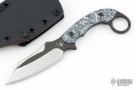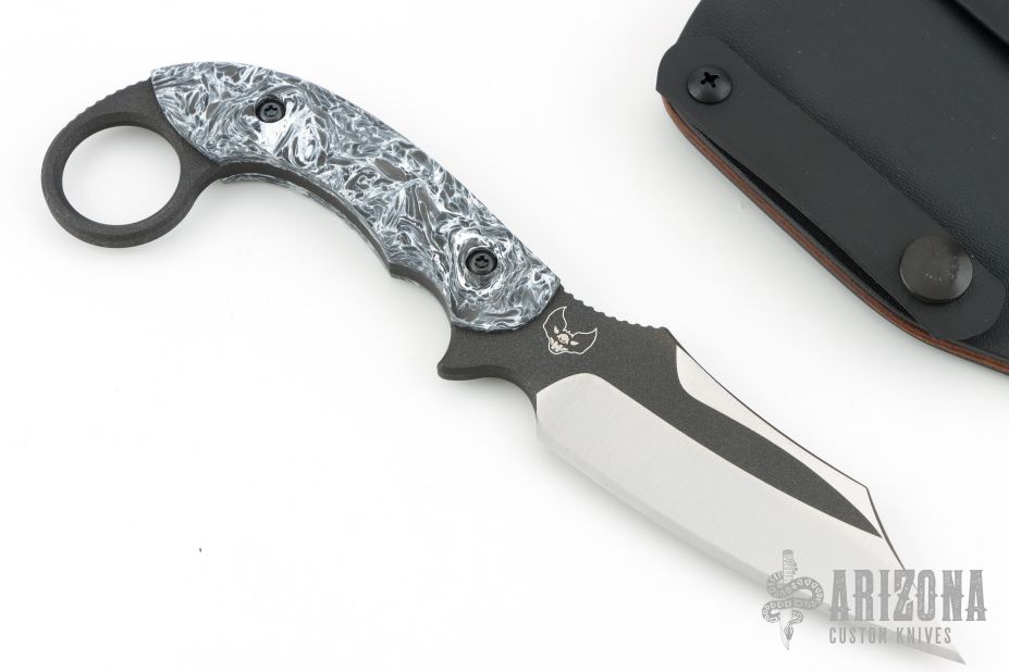 This KaramBat by Bat Cave Blades is inspired by the traditional Karambit style fighting knife. This knife has a black coated Nitro-V blade with satin grinds, sharpened to 18 degrees, notched thumbrest, .190" blade stock, 1.406" blade depth, full tang construction. The handles are contour pattern Dark Matter Polar Fat Carbon scales. Includes a leather lined, black kydex sheath and COA. New from maker!