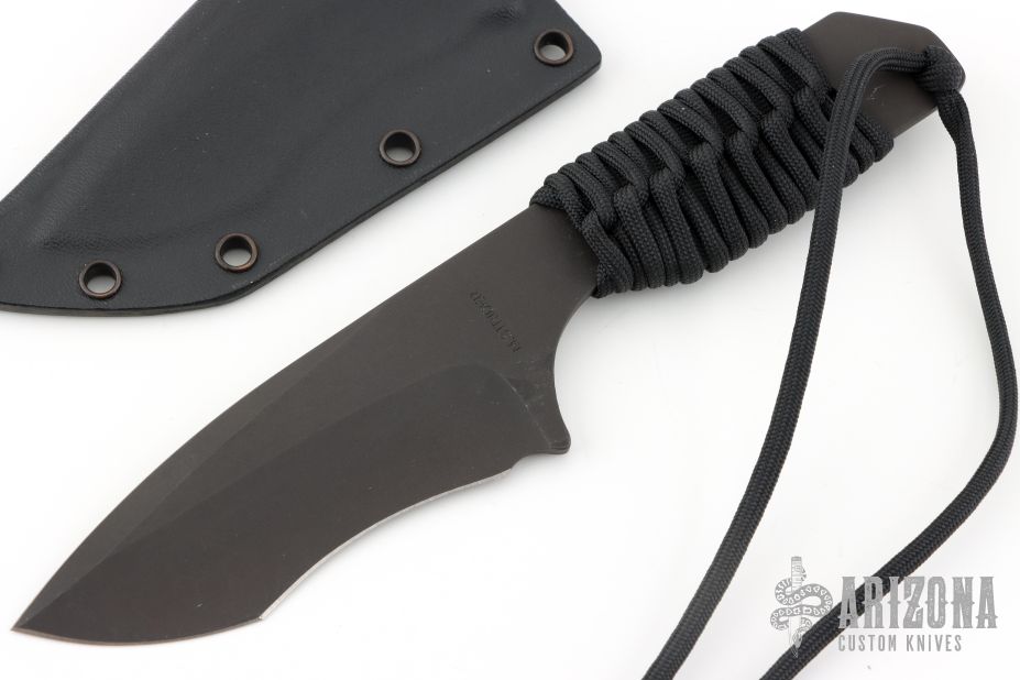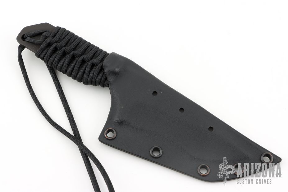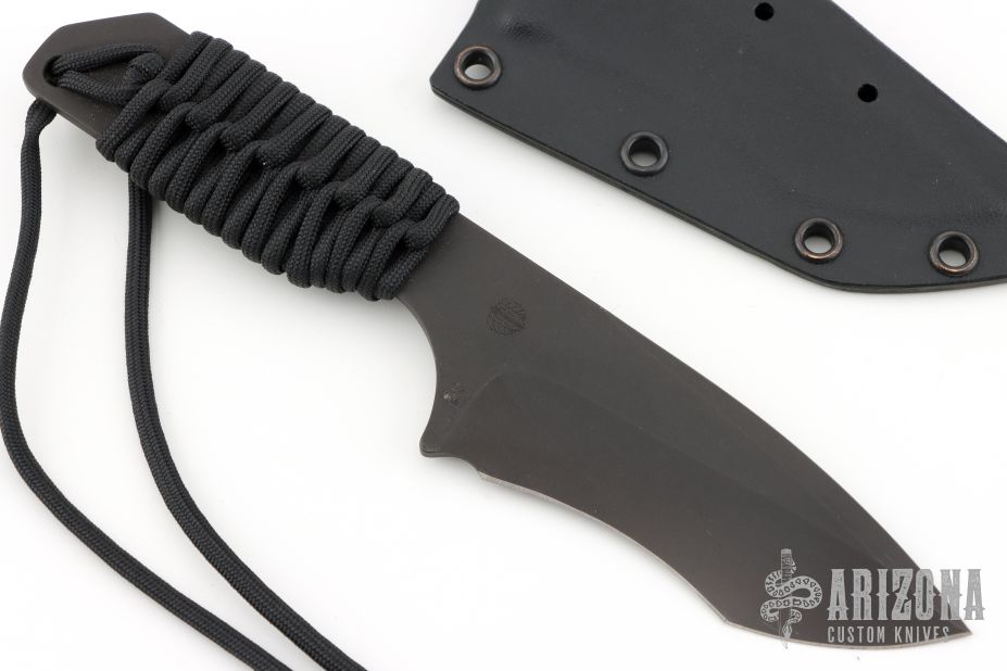 The EB DB by Mick Strider features a black blade with false top edge, .143" blade stock and 1.700" blade depth, full tang construction with black paracord wrapped handle. Comes with kydex sheath. Has a couple light scuffs, otherwise excellent condition.