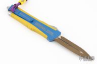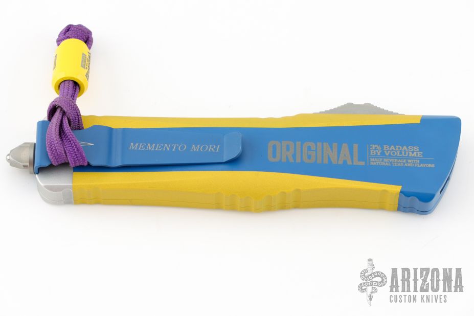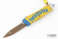 This Combat Troodon OTF automatic features a bronze coated D/E blade with one fully serrated edge. The handle is composed of an aluminum frame with "Twisted Tea" motif. Stainless steel clip. Glass breaker. "Memento Mori" on clip. Excellent condition. Comes with original box and papers