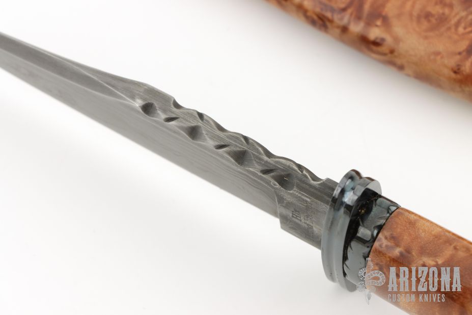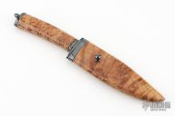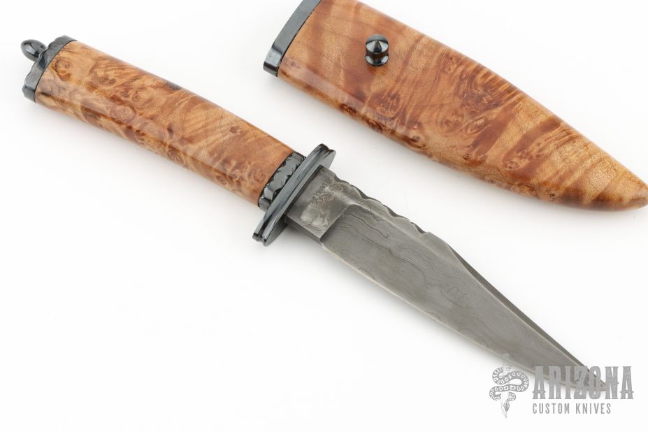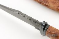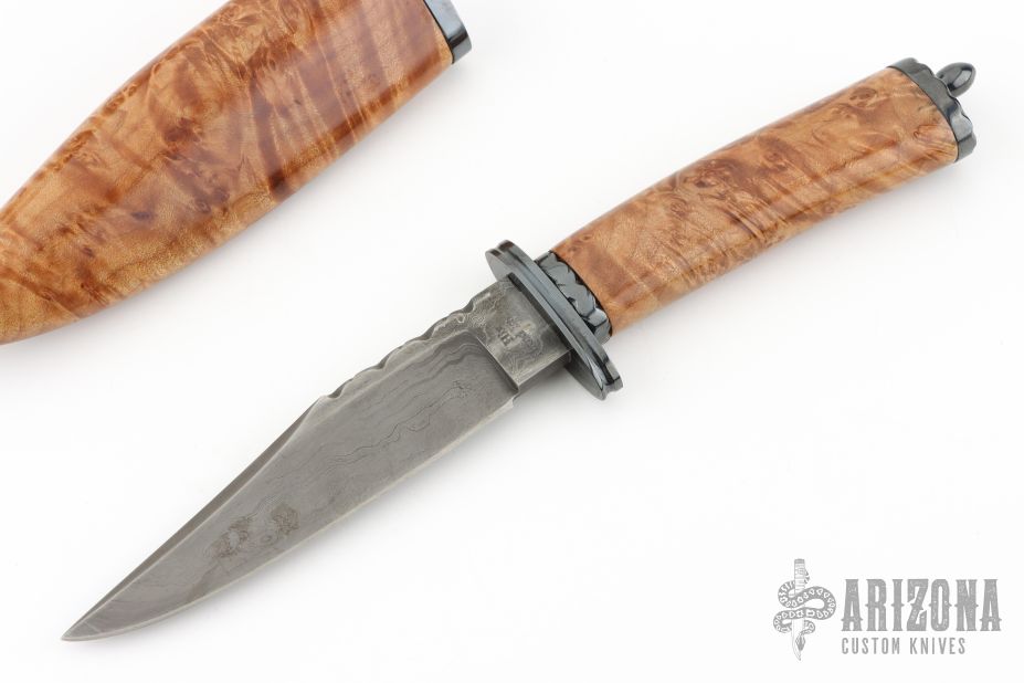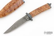 This gent's Bowie from Hix Hand Forged features a polished clip point Damascus blade with file worked blade spine, .253" blade stock and 1.087" blade depth, hidden tang construction. The handle has a fluted and blued guard, collar, butt, and tang nut. The grip has very nice polished maple burl. Comes with an equally impressive maple saya with blued steel accents. Has a few light scuffs and scratches. Excellent condition otherwise.