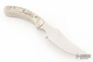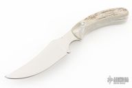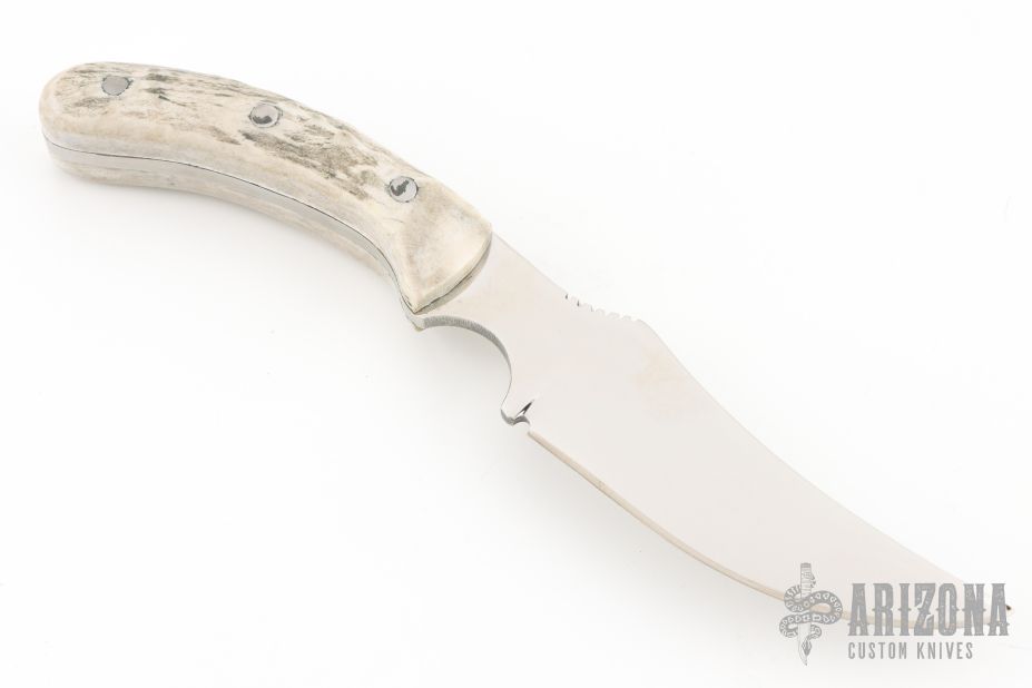 This stag hunter features a mirror finished blade with .184" blade stock, 1.323" blade depth, notched thumb ramp and full tang construction with stag scales and steel pins. Has a couple light scratches, excellent condition otherwise.