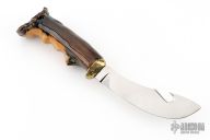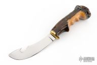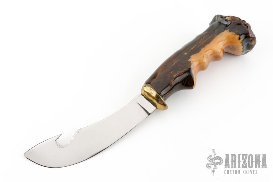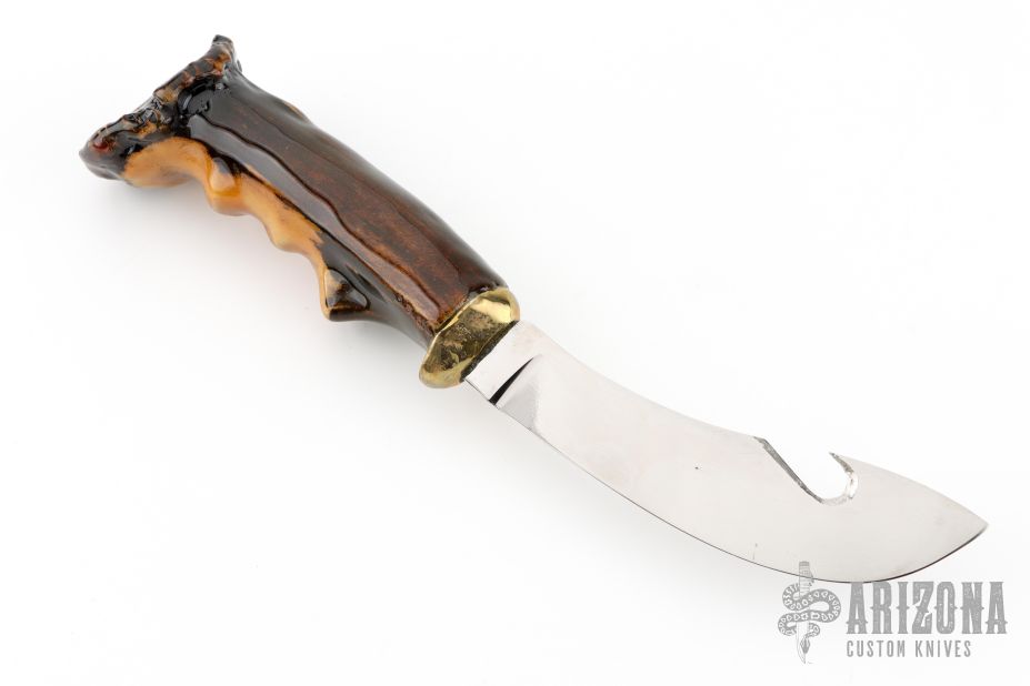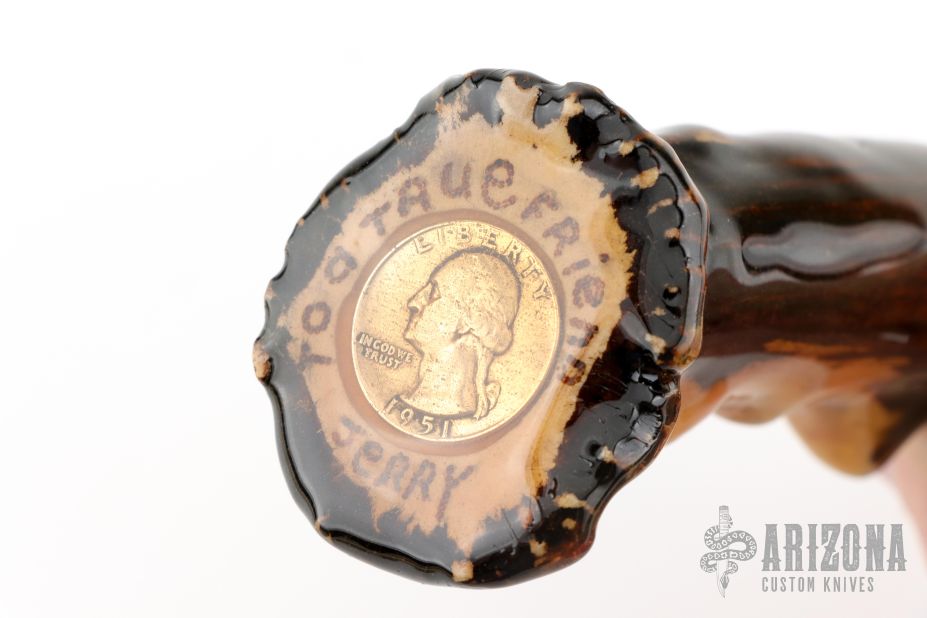 This features a mirror polished blade with Guthook, .145" blade stock and 1.293" blade depth, hidden tang construction. The handle has a brass guard and epoxy covered crown stag grip. Pommel has 1951 quarter inlay, with a note that says, "to a true friend Jerry". Has some light scratches, and patina. Great condition otherwise.